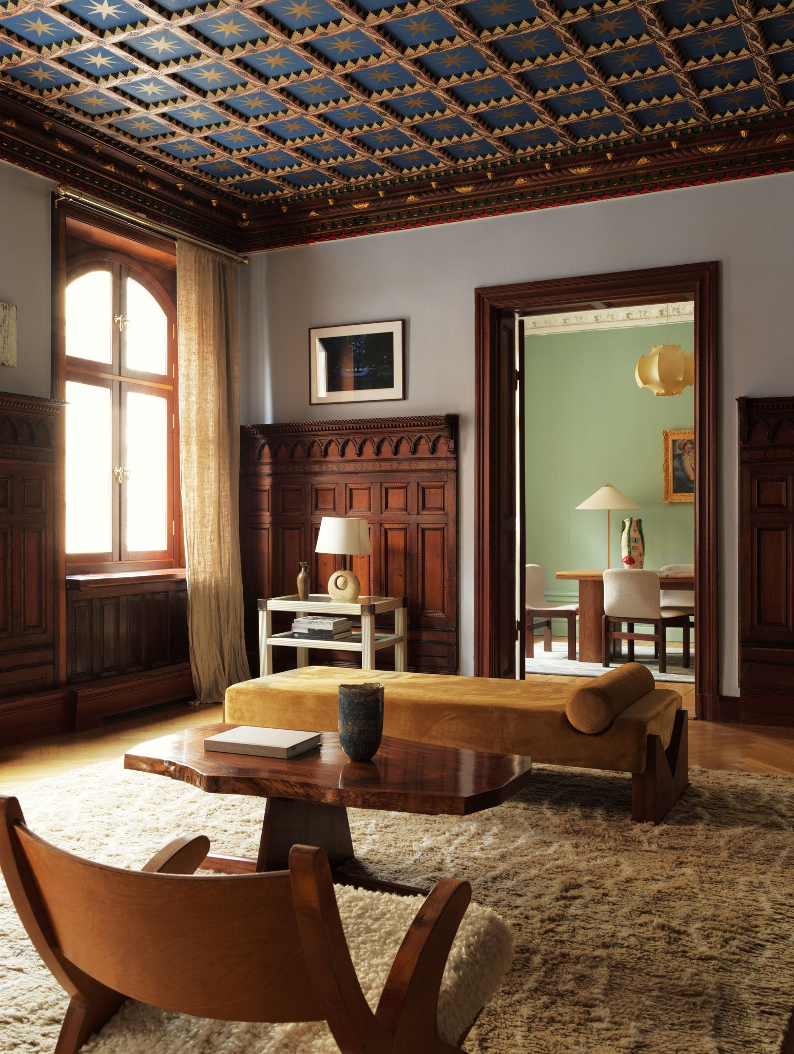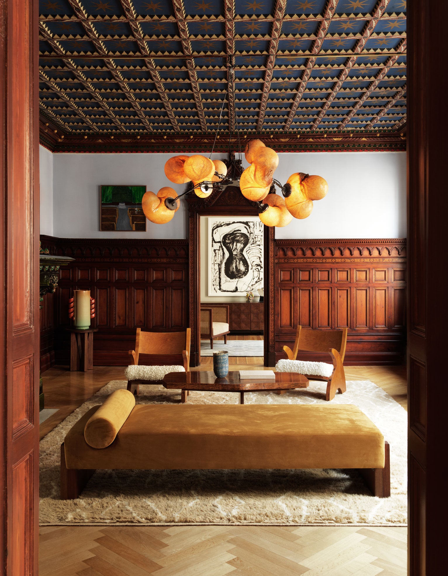 Daybed V is a unique piece of furniture handcrafted by experienced artisans who pay attention to every detail of carpentry and upholstery. The characteristic "V" shaped legs give it a unique character and are a recognizable element of many Dusty Deco projects. The solid beech wood construction has been stained and waxed, giving it the appearance of classic vintage furniture.