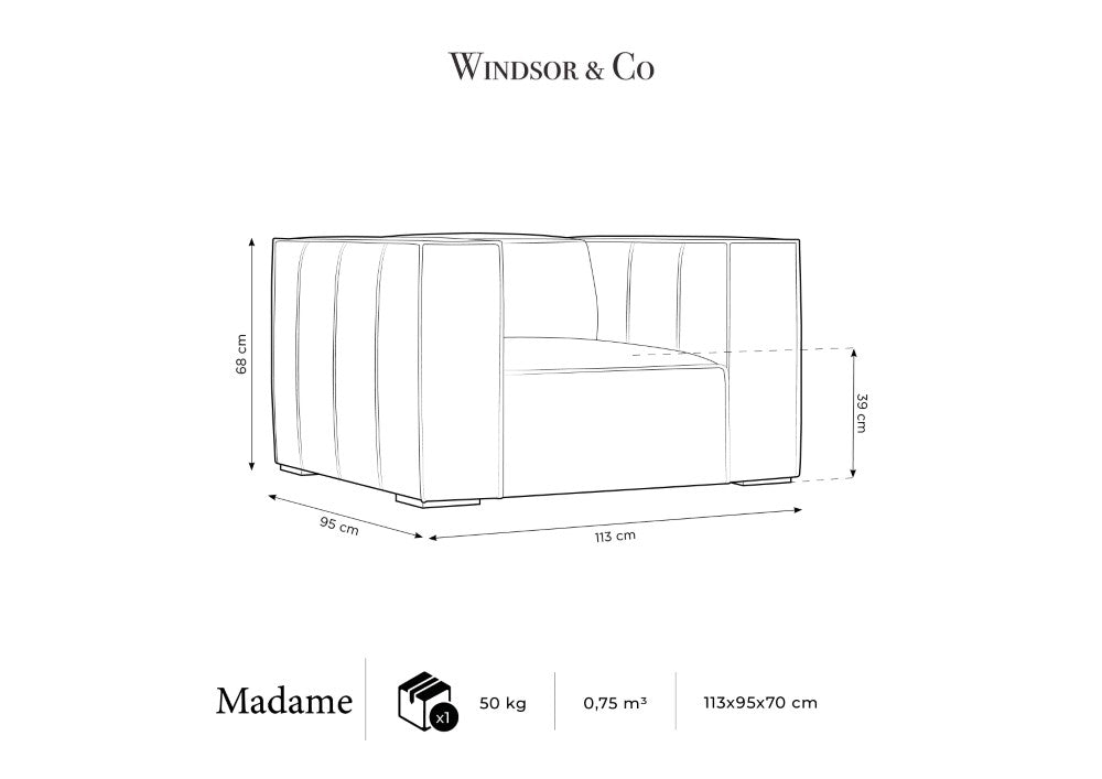 Wide armrests connect with a comfortable backrest, creating the ideal conditions for relaxation and unwinding after a long day. The exclusive Madame collection impresses with its high-quality craftsmanship and upholstery made of cowhide. It will be the perfect complement to a spacious living room or a luxurious office.
