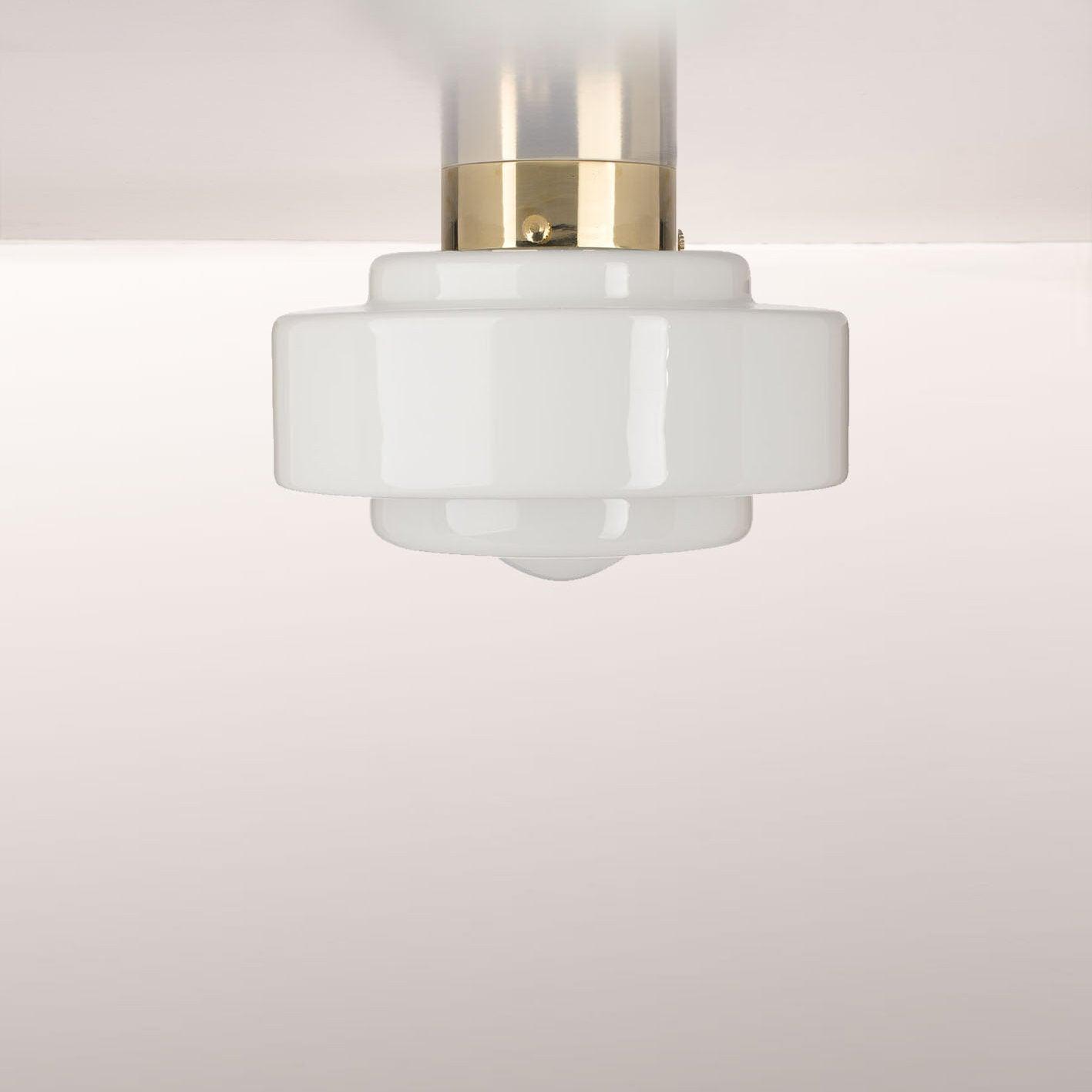 Designed in the spirit of Art Déco ceiling Mémoire is pure poetry of geometry. The lampshade was made by local metallurgists with a traditional method of blowing glass in form. The three -layers resulting in this way scatters the light in an extremely soft and delicate way, giving the room a sensual, soothing mood. The base is a lid of natural brass, which in time darkens and covers with a charming patina. Mémoire also occurs in a silvery nickel finish.