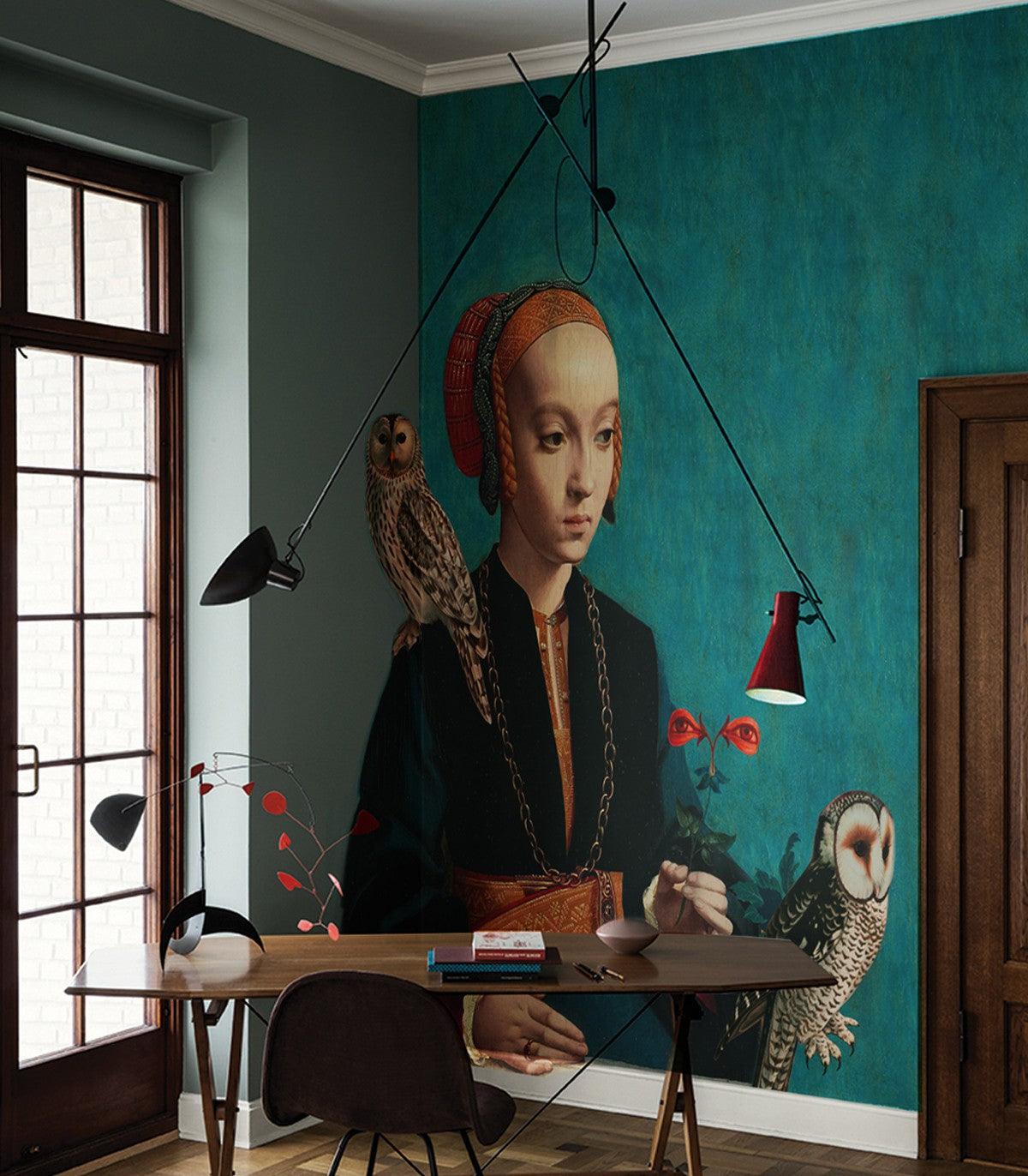 Non-woven wallpaper portrait OWL LADY turquoise