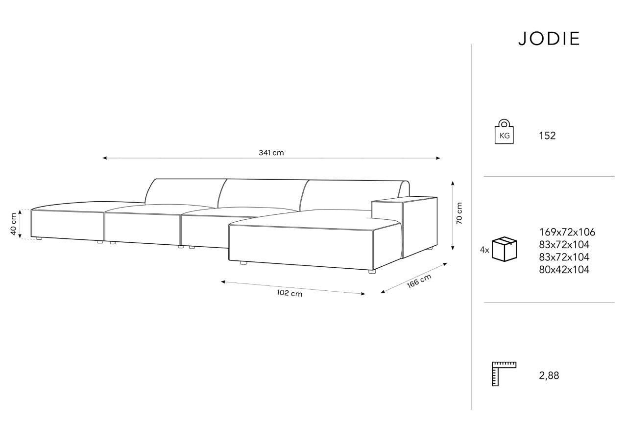 Jodie is a spacious five-seater corner sofa. This sofa is the perfect choice for those who value not only functionality but also the stylish appearance of their interior. The velvet fabric gives the sofa an elegant and chic look while providing softness and comfort during use.