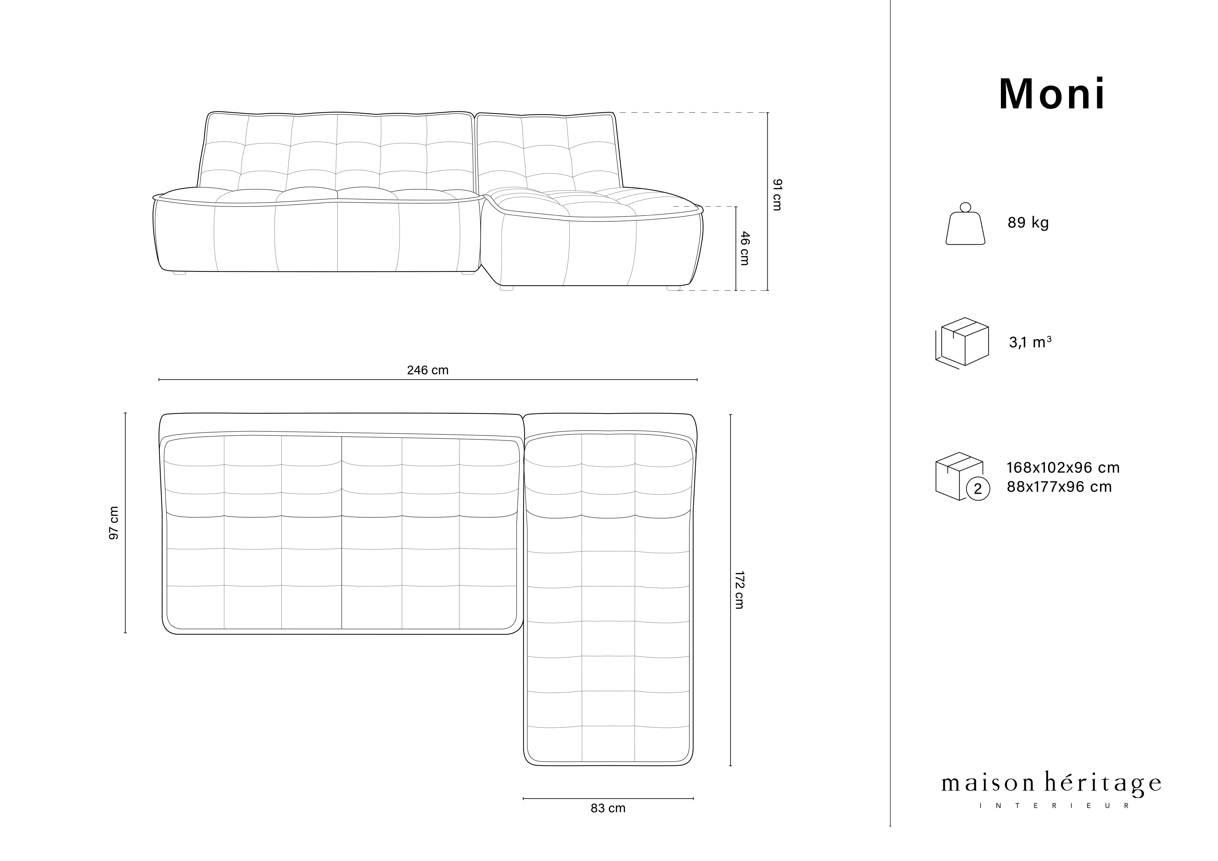Leather corner sofa for four people Moni defines functionality and comfort combined with modern design. Stylish tufting and an original shape will work perfectly in both an elegant living room and a modern office. The line of the seat and backrest is curved and features a gently contoured indentation, offering extraordinary user comfort.