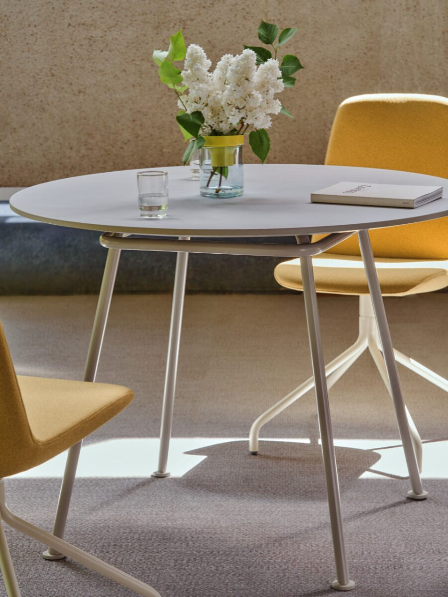 The 750 mm high top is made of MDF, covered with easy to care linoleum. The varnished edges are matched to the frame, which strengthens the modern appearance of the furniture. The table is available in a wide range of intense colors, perfectly fitting into office, hotel and gastronomic spaces.