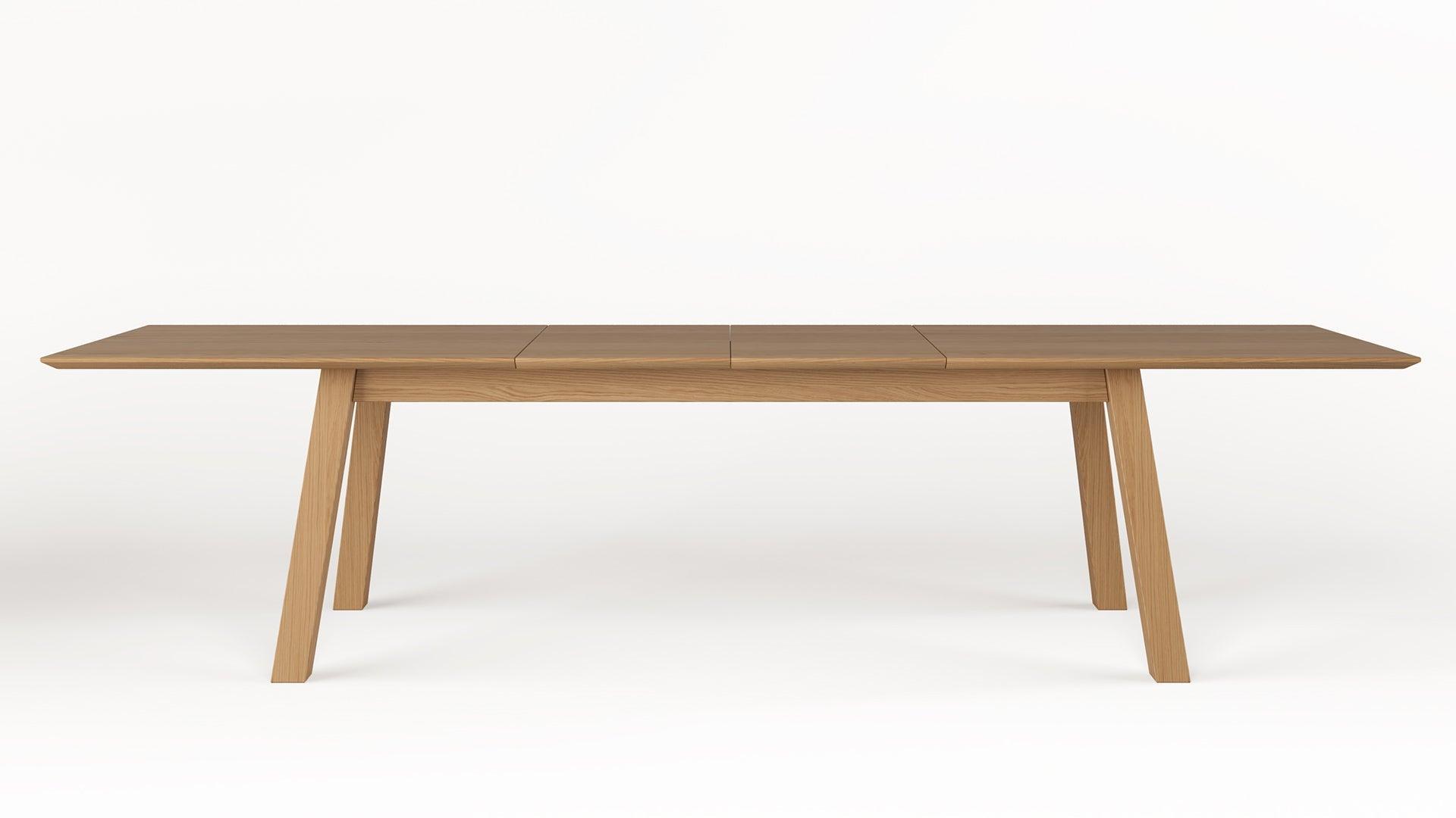 The 3 cm thick top, fierce at an angle of 45 degrees, ensures lightness of the structure. Legs with a cross -section of 8 x 8 cm, set at an angle of 8 degrees, guarantee stability. Under the countertop there is a oskrzynia hiding the sliding system and inserts. The countertop is divided in the middle, and the inserts can be spread one by one like a book. Alternatively, the countertop can be Sunday, with inserts extended on one side.