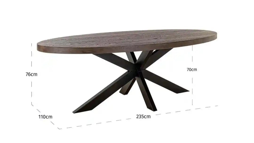 Elegant oval table Watson is a combination of the natural beauty of wood and the solidity of metal, creating a striking piece of furniture for the dining room or living space. The thick oak top delights with its deep grain pattern, while the black metal base in the shape of spreading arms gives the whole a modern, industrial character.
