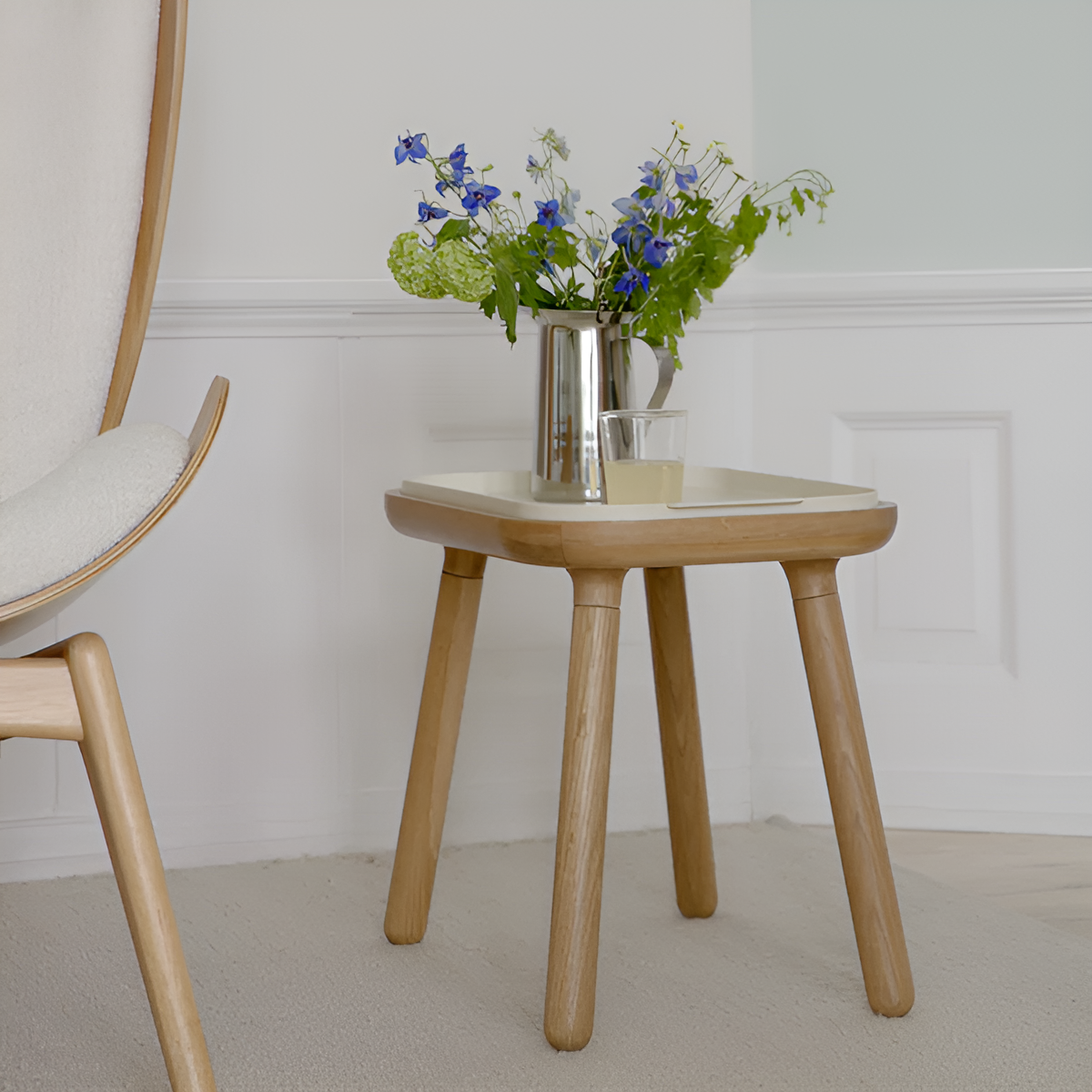 PAFF table in pearl white with an oak base