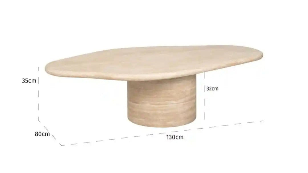 Elegant coffee table Fictus with an irregular top is a proposal for those seeking unique furniture that will bring a modern character to the interior. The combination of travertine imitation, iron, and MDF board makes the piece both sturdy and striking. The gently rounded edges of the top give it an organic lightness, while the cylindrical base introduces an element of minimalist geometry.