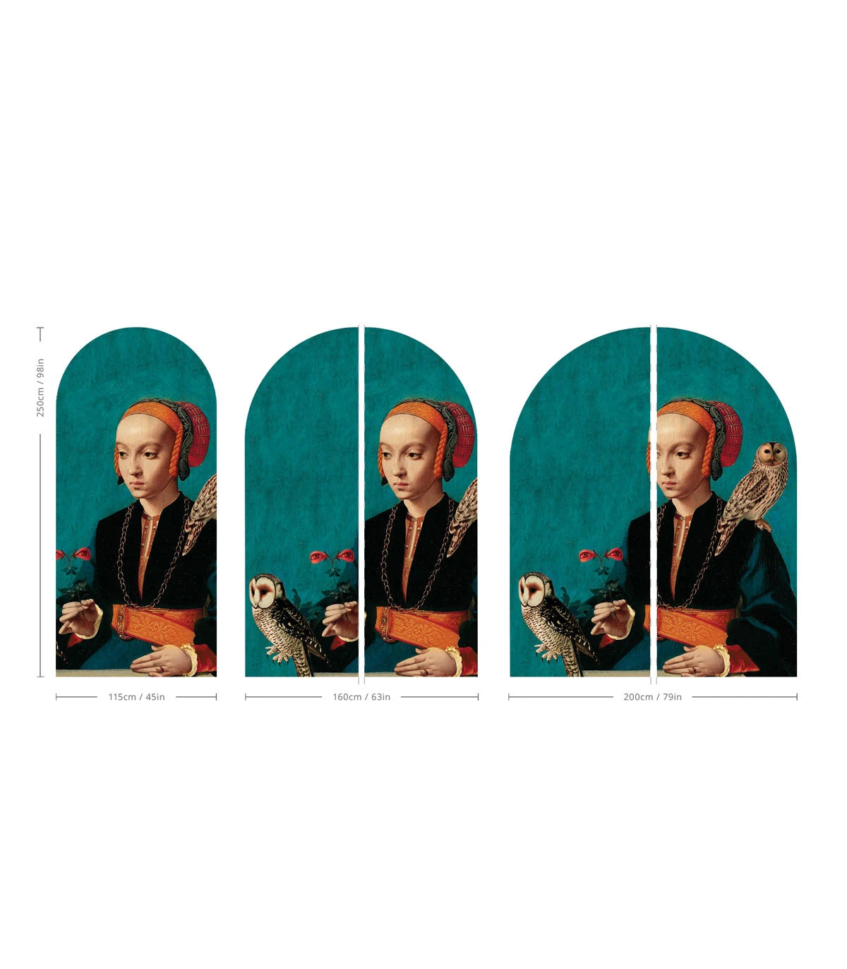 The arch-shaped wallpaper Owl Lady is a wall decoration that combines classic painting motifs with subtle elements of surrealism. The portrait of a woman with an owl on her shoulder, complemented by floral details, creates a composition full of elegance, depth, and artistic mystery. The delicate transitions of colors and the soft form of the arch emphasize the refined character of the pattern, making it a unique decorative accent in the interior.