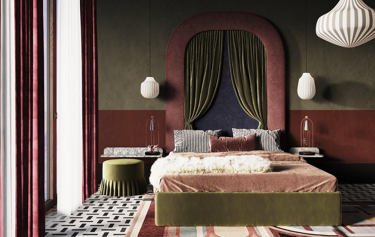 Łóżko tapicerowane ALICE róż z zieloną kurtyną Happy Barok    Eye on Design