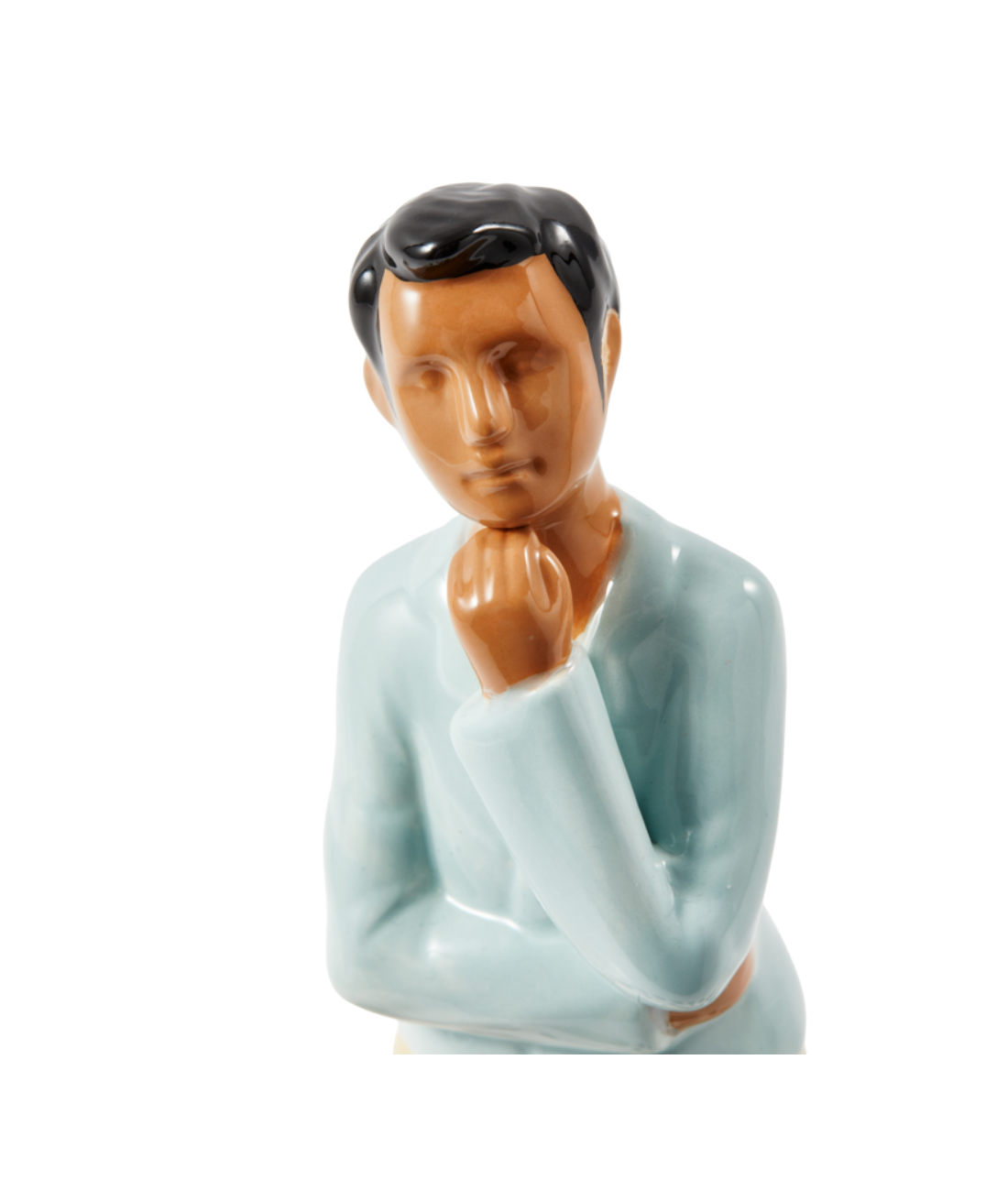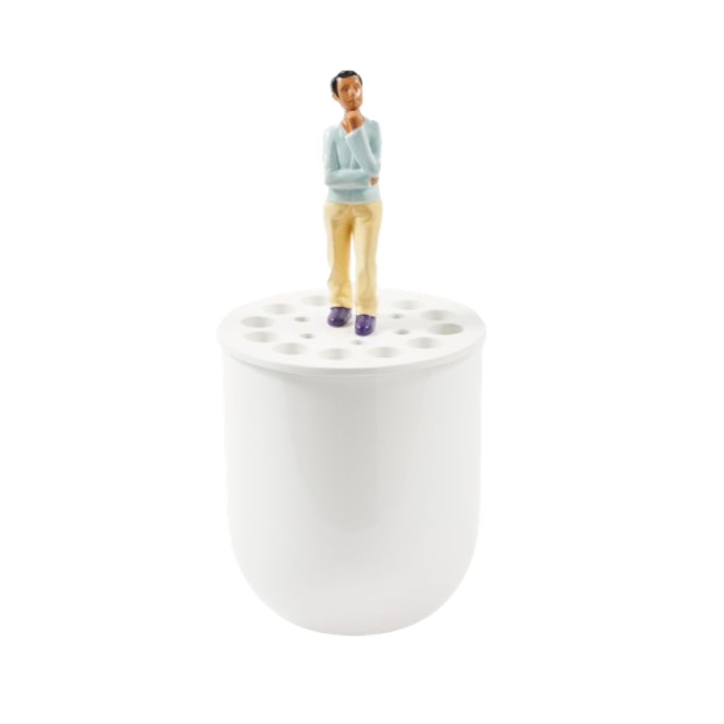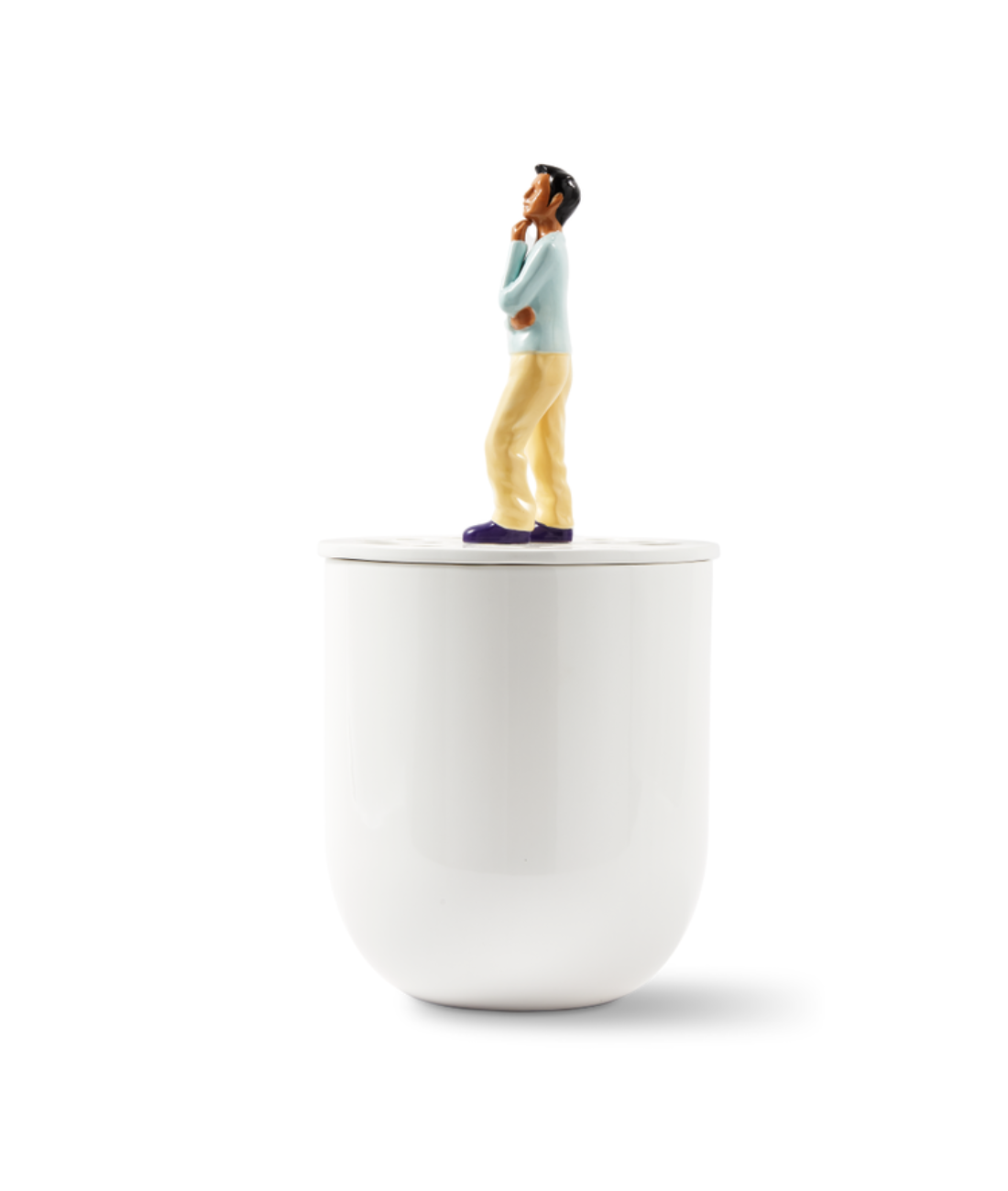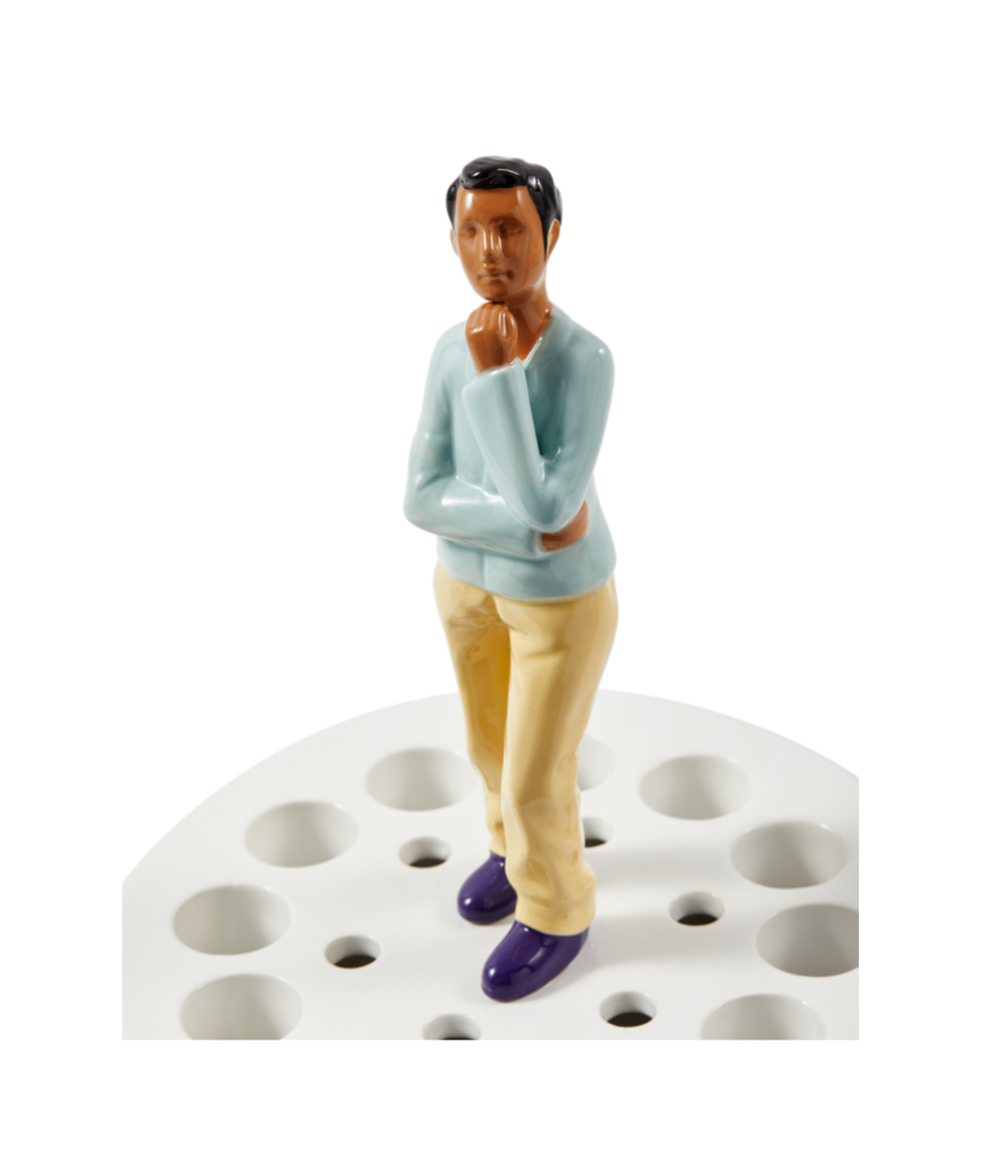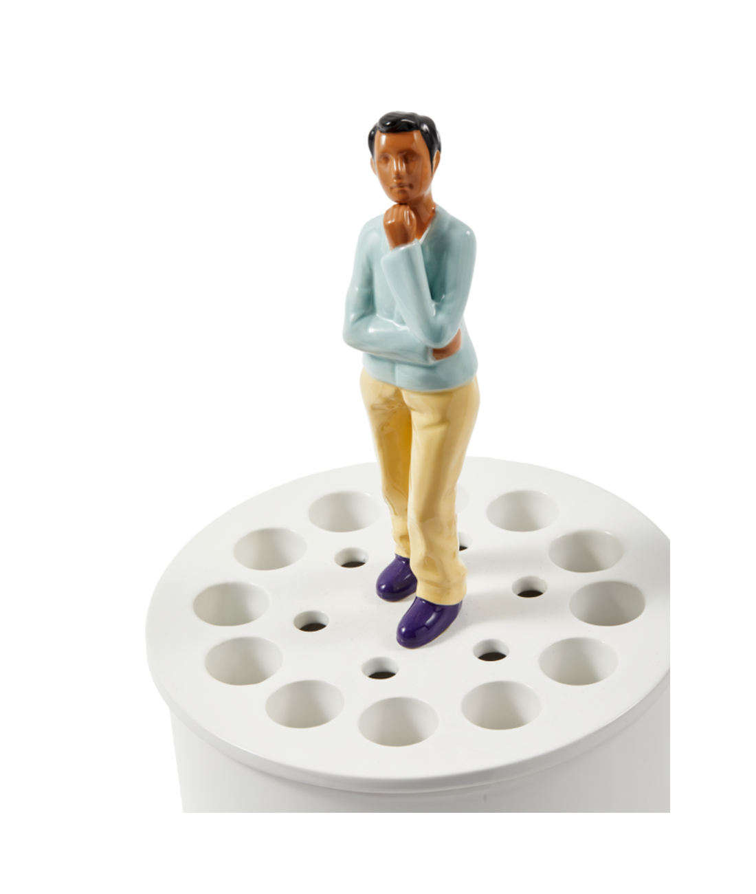 Amidst the flowers, a contemplative man emerges. What is on his mind? The Day Dream vase, designed by the duo Koens & Middelkoop, is a unique ceramic piece that adds depth and a narrative quality to the arrangement. Branches and flowers form a circle, encircling the figure lost in thought.