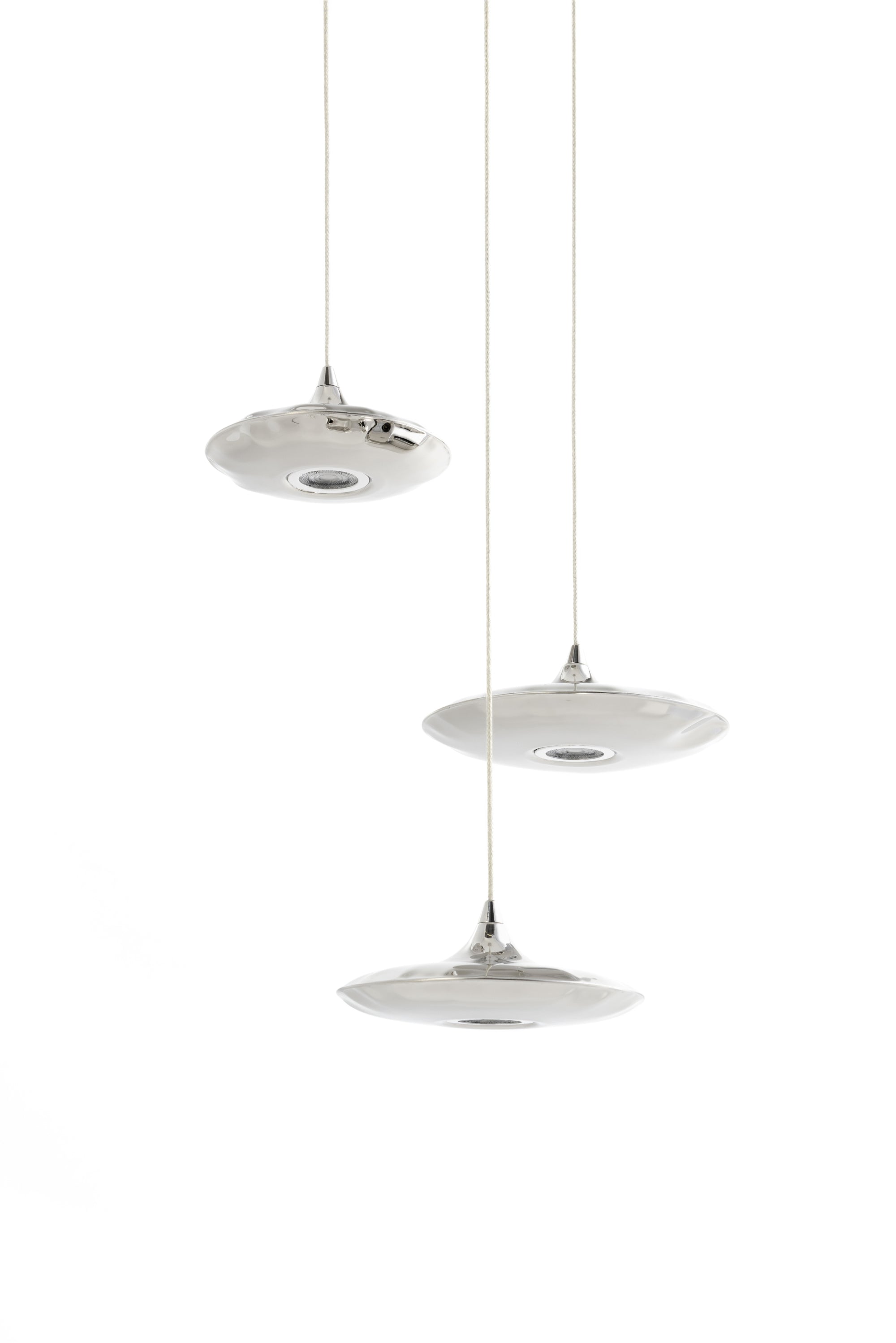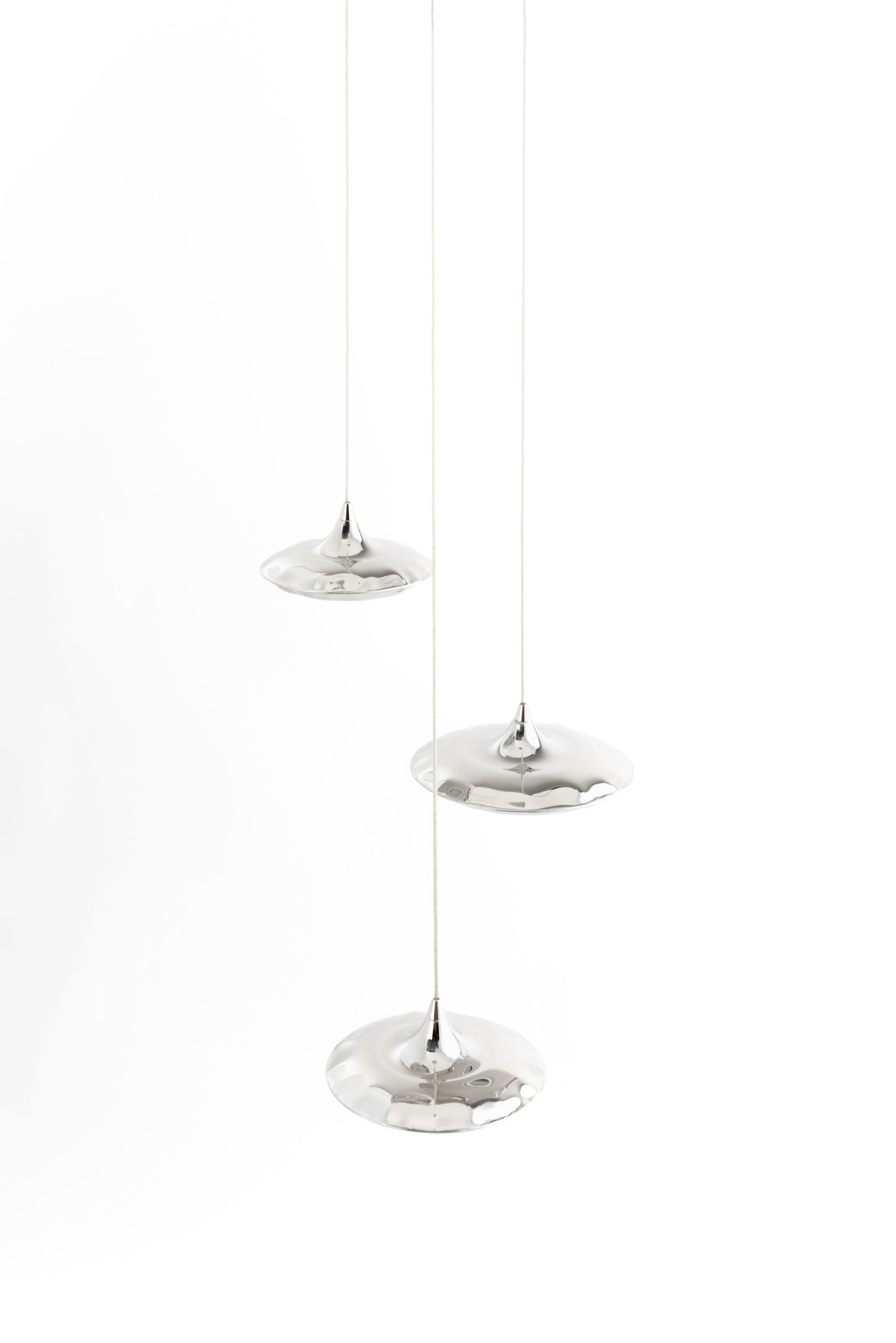 Hanging Lamp Set Lampin is a luminous accent with a distinctive form and light, sculptural aesthetic. Made from curved stainless steel, each shade is created using the FiDU process – a technology that allows for unique deformations at the edges. These irregularities give the lamps character and ensure that each piece is slightly different – much like handcrafted items. Lampin is a subtle light source that enriches the space not only with its function but also with a story about modern craftsmanship.