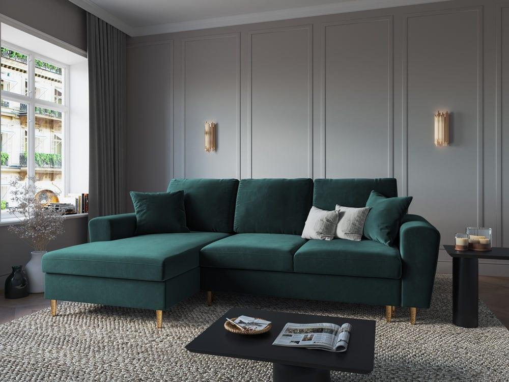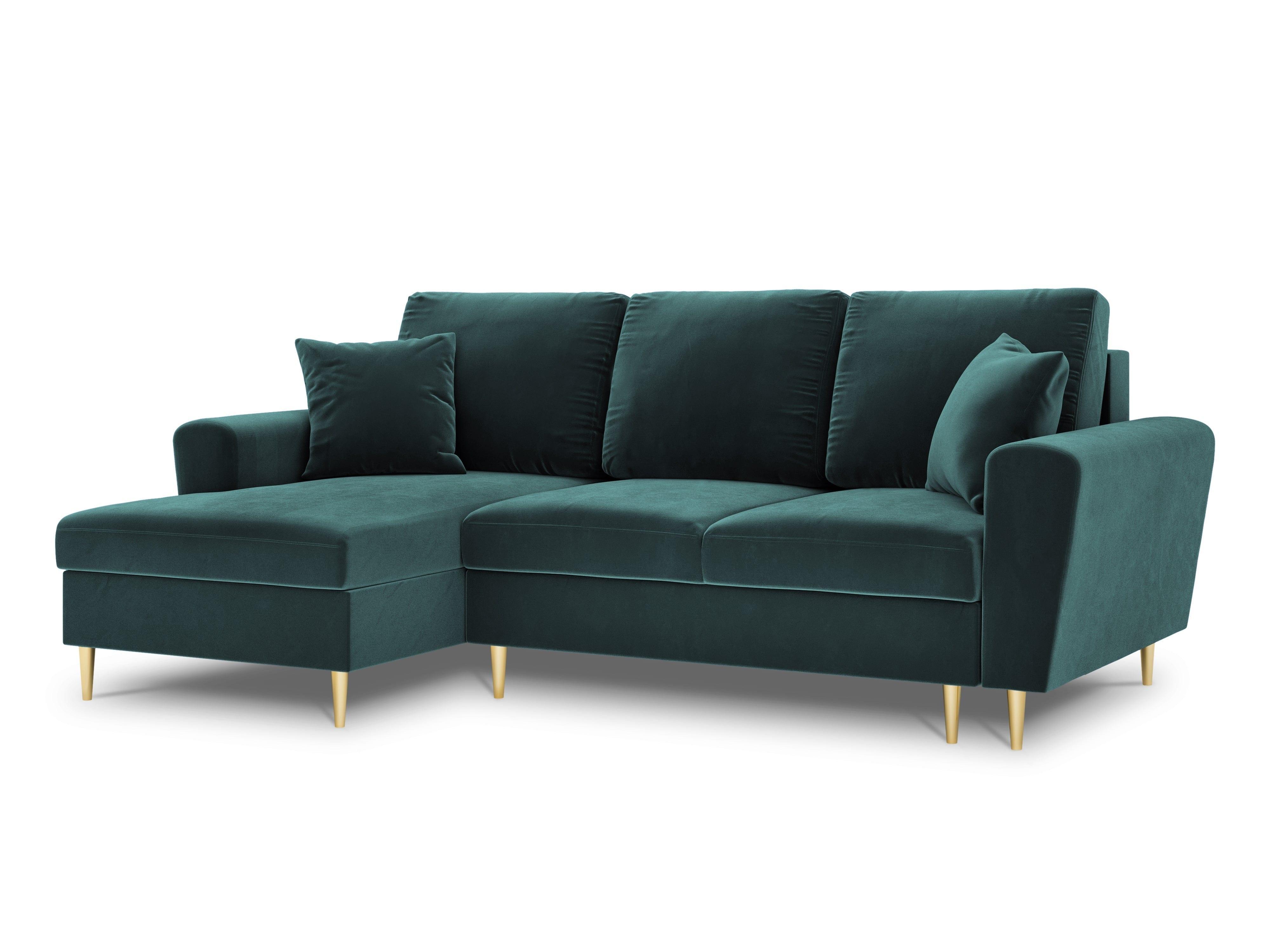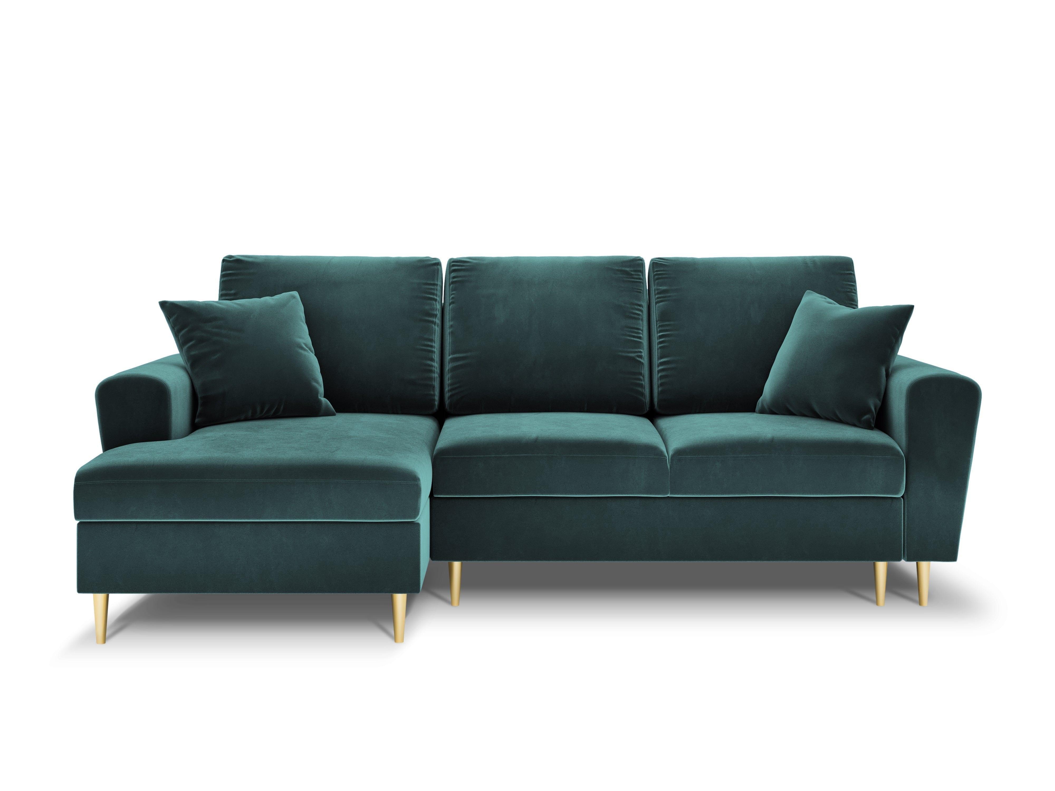 Linker fluwelen hoekbank met slaapfunctie KYOTO petrol met gouden basis