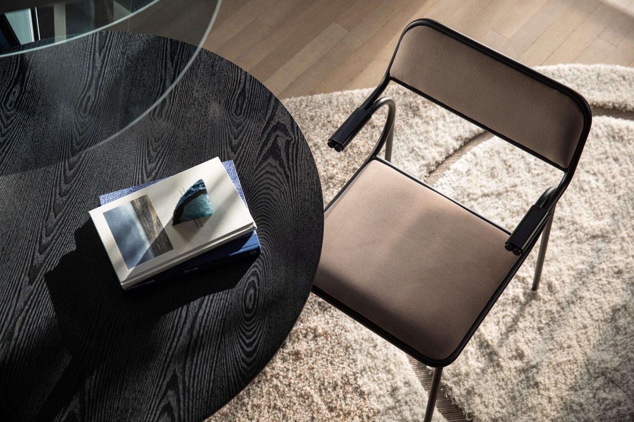 Alba betekent zonsopgang in het Italiaans, wat verwijst naar de gebogen frame. Breng uw ochtenden door aan de eettafel, genietend van de komende dag in de bijzondere stoel Alba. Het matte zwarte metalen frame met uitgesproken gebogen armleuningen biedt comfortabele ondersteuning. De met zacht fluweel beklede zitting en rugleuning zorgen voor uitstekend comfort.