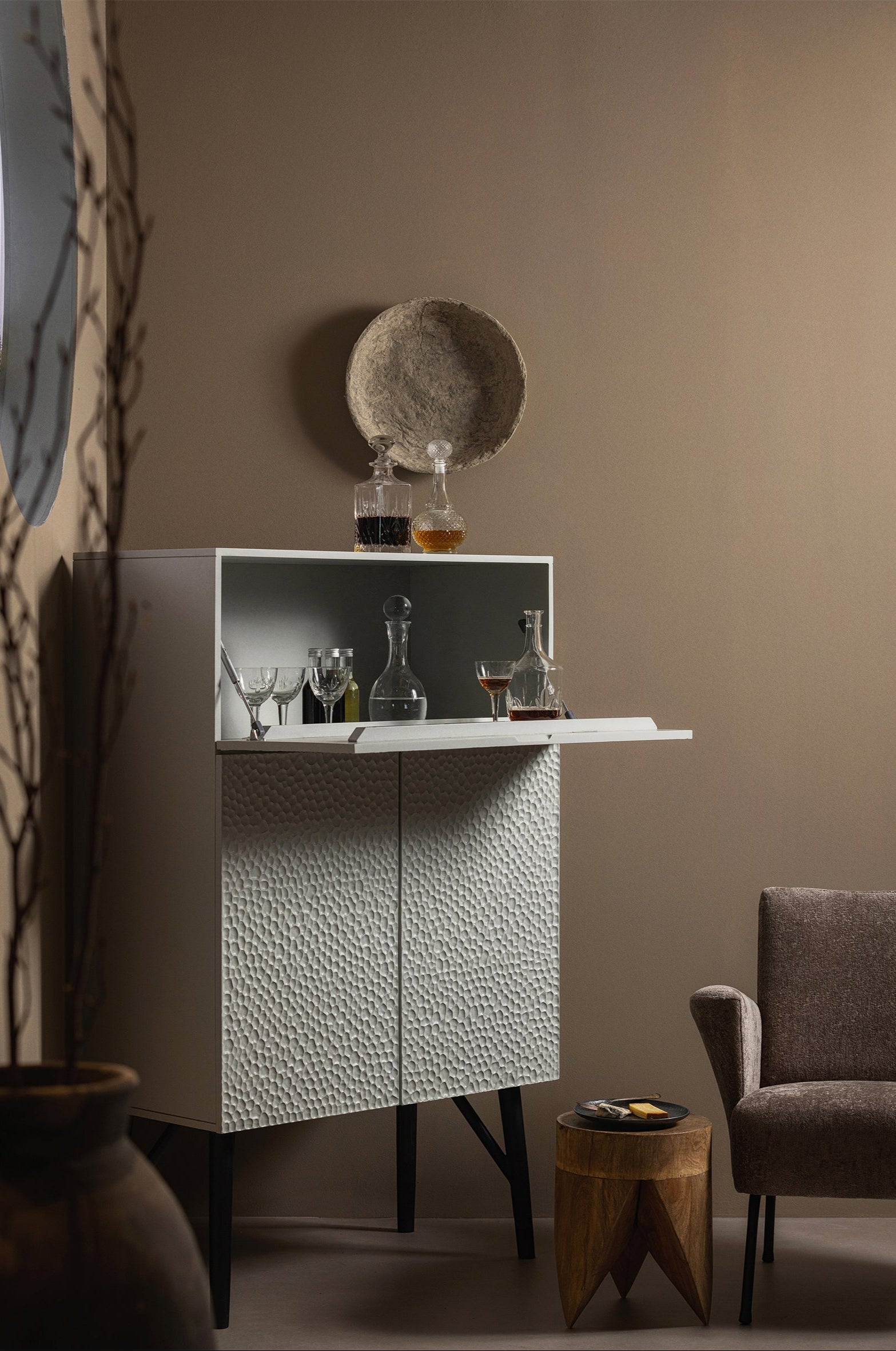 Barek is een opvallende keuze voor het opslaan en tentoonstellen van uw favoriete dranken en glazen. De Carved-collectie valt op door het indrukwekkende, grafische patroon op de fronten, geïnspireerd op de oosterse beeldhouwkunst. Elke front doet denken aan een miniatuurlandschap van de woestijn, en de delicate tint van mist geeft het geheel een elegante en rustige uitstraling.