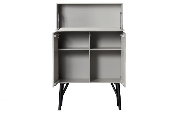 De bovenste open ruimte is perfect voor het tentoonstellen van glazen of decoratieve accessoires, terwijl het onderste gedeelte, verborgen achter de deuren, extra opbergruimte biedt. De slanke, hoge poten voegen een gevoel van lichtheid en een modern accent toe.