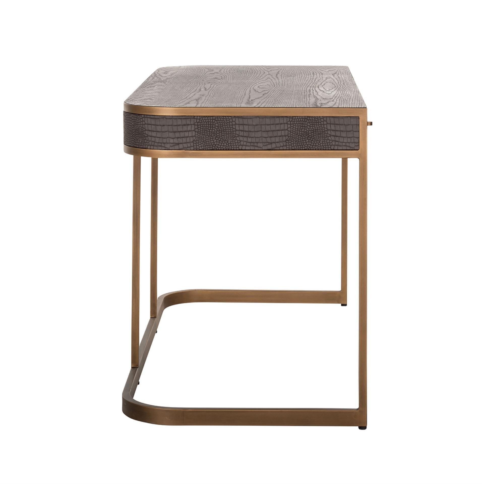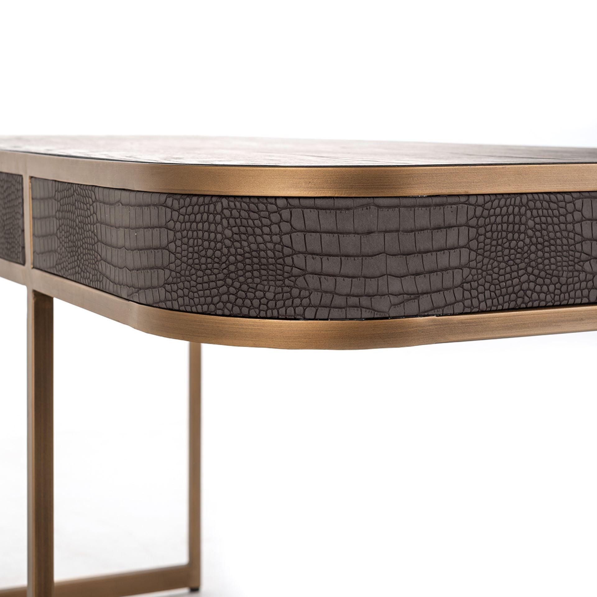 Het unieke ontwerp van bureau Classio is geworteld in de glamourstijl. Bruin leer en gouden metalen accenten creëren een combinatie die luxe en prestige uitstraalt. Het is een meubelstuk dat niet alleen zijn praktische functie vervult, maar ook een decoratief element is dat de aandacht trekt en elegantie aan de ruimte toevoegt.