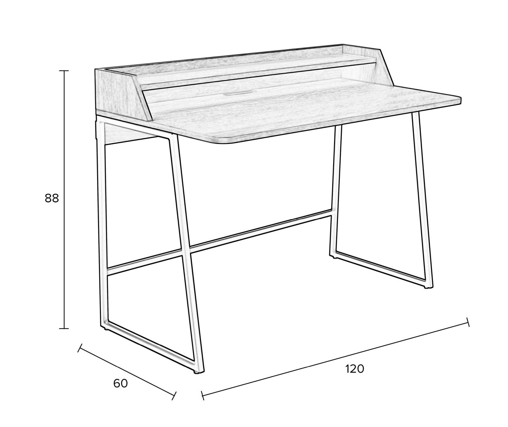 Bureau Giorgio met opzetstuk is een praktische meubel met een eenvoudige en moderne uitstraling. De basis bestaat uit zwarte, metalen sledevoeten in trapeziumvorm, poedergecoat. Het bureaublad is gemaakt van MDF met een eikenfineer, waarbij de zichtbare houtnerven een aantrekkelijk contrast vormen met de zwarte basis. Boven het blad bevindt zich een handige plank, die extra opbergruimte biedt. Bureau Giorgio past perfect in verschillende interieurs, zoals een kantoor, tienerkamer of woonkamer. Dankzij de natuurlijke tint van het blad en het opzetstuk, evenals de gladde metalen poten, past het uitstekend in een loft-, Scandinavisch, modern of vintage stijl.