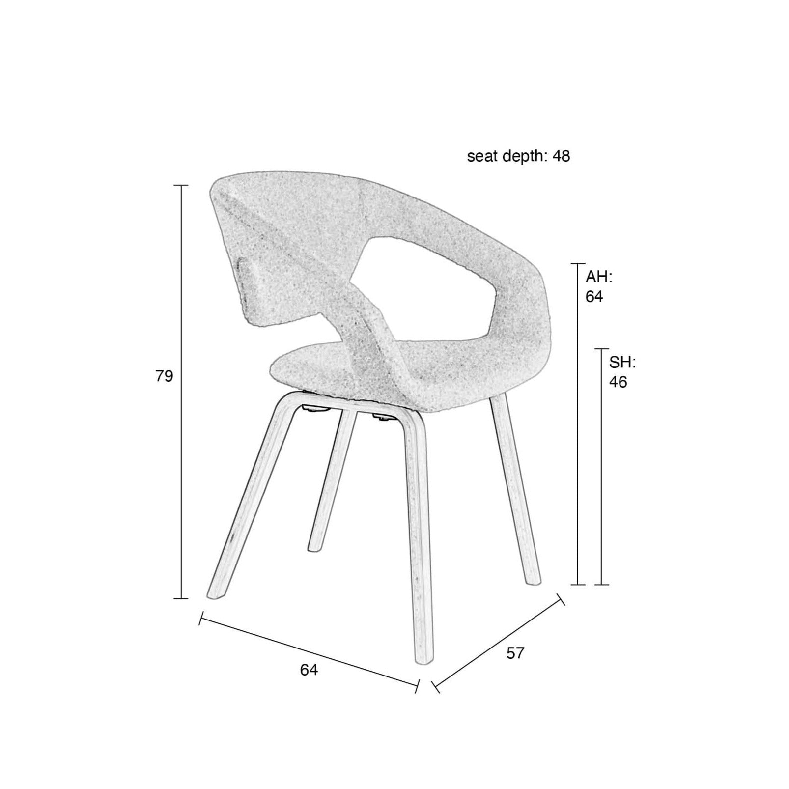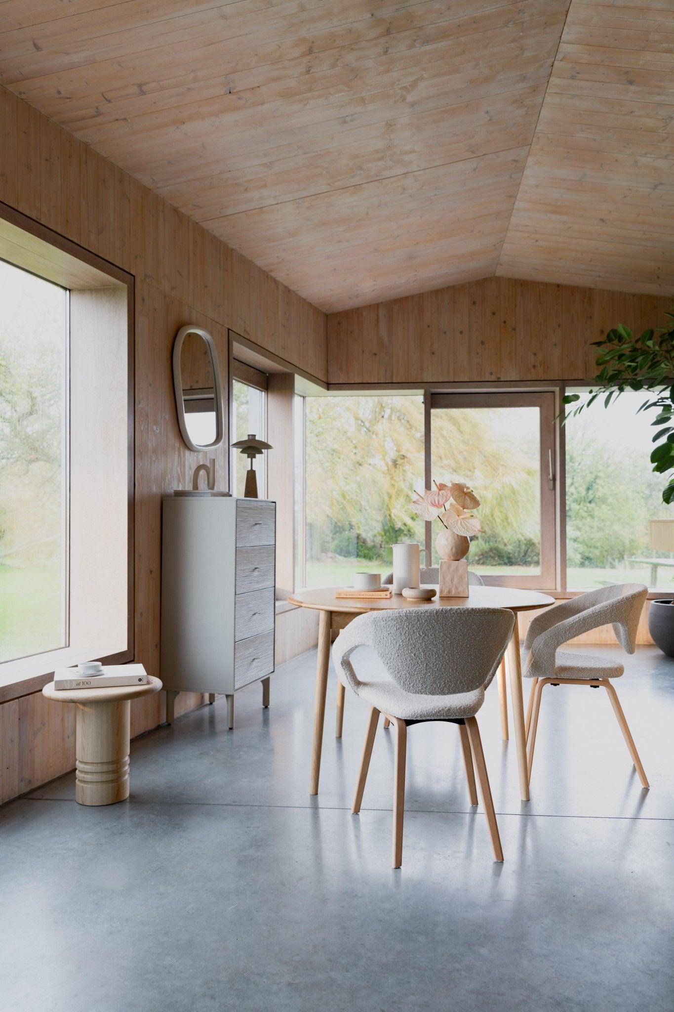Siedzisko z tapicerką bouclé zapewnia wygodne miejsce do siedzenia. Podstawa wykonana jest z drewna bukowego.