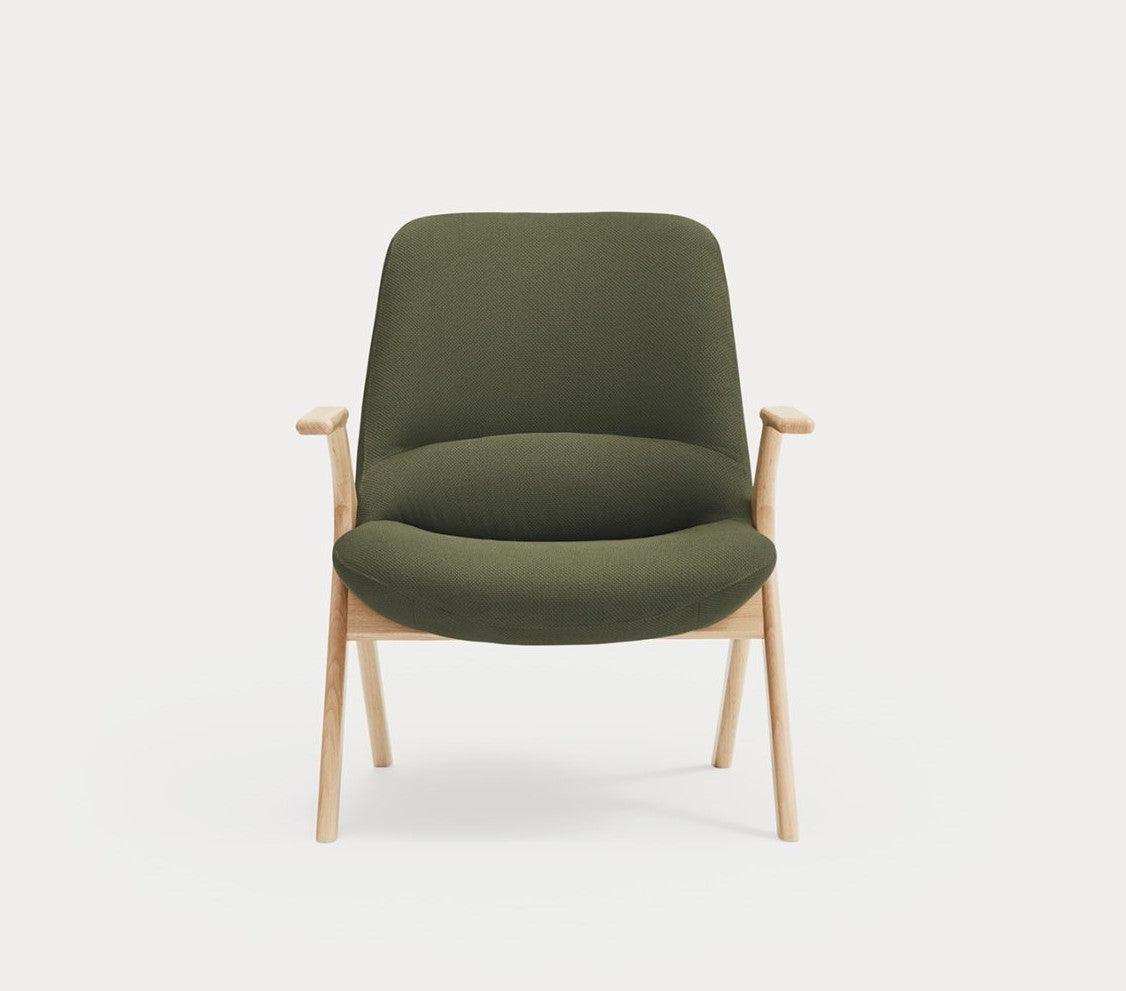 Fauteuil Dins in donkergroene kleur is een meubelstuk dat een combinatie vormt van twee tegengestelde concepten, die in harmonie met elkaar samenleven. De zachtheid en warmte van de houten constructie van de fauteuil Dins zijn volledig geïntegreerd met de ruime, gestoffeerde romp.