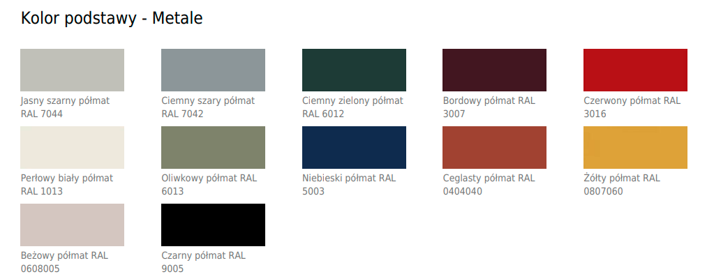 Podstawa - 4 nogi metalowe malowane proszkowo; stelaż Ø25 mm, grubość ścianki 1,5 mm; stelaż gięty CNC; nogi - zakończone stopkami tworzywowymi w kolorze białym - stelaż biały lub czarnym - pozostałe kolory stelaża