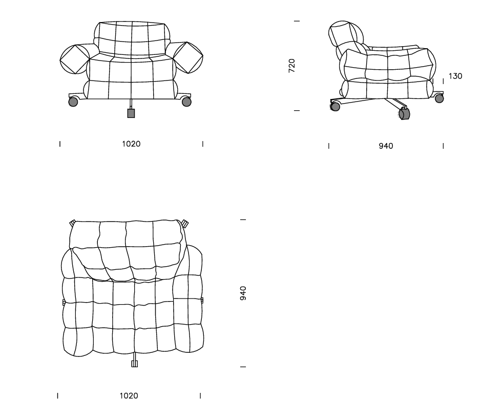 Hij is gemakkelijk te herkennen aan de basis met wielen, de hoekige armleuningen en de zachte, gestikte stof. Parfait is het resultaat van experimenten in het programma Marvelous Designer, met de ambitie om een zachte, comfortabele, gestikte vorm en een luchtige esthetiek te creëren.