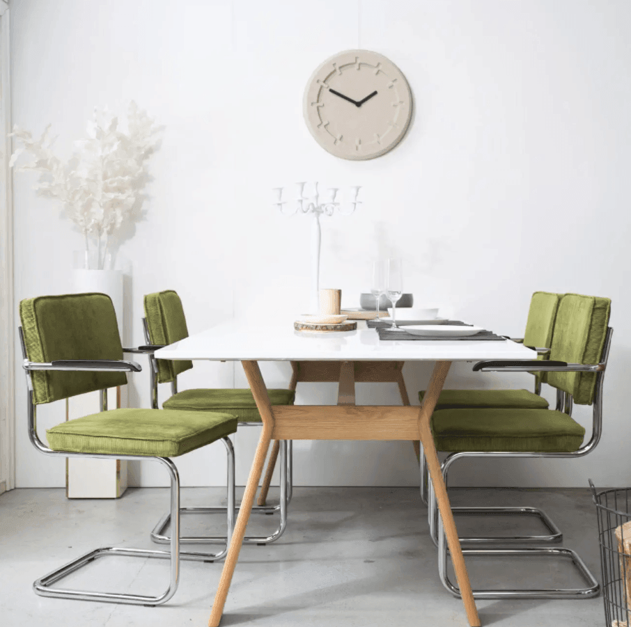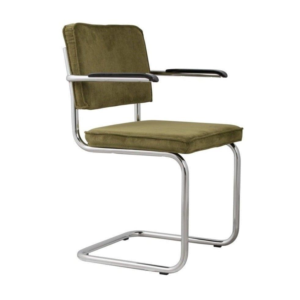 Ridge Rib is een tijdloos stoel, dat opvalt door het unieke frame. Het fluwelen, groene afwerking en de sledebasis van verchroomd metaal vormen een geweldige combinatie van vintage en modern design.