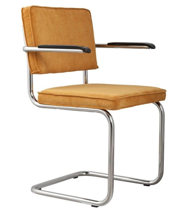 Ridge Rib is een tijdloos stoel, dat opvalt door het unieke frame. Het corduroy, gele afwerking en de sledebasis van verchroomd metaal vormen een geweldige combinatie van vintage en modern design.