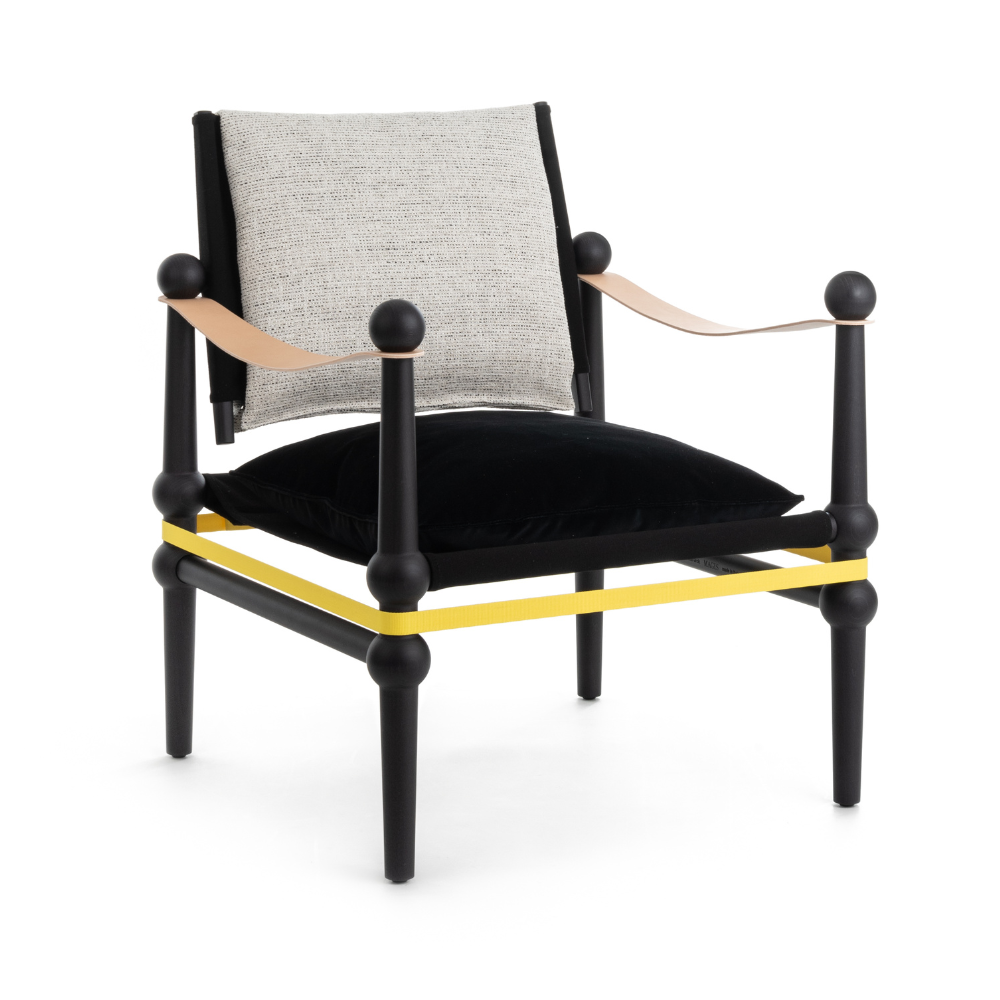 Fauteuil Twain valt op door het kenmerkende, open frame met zichtbare verbindingen van materialen, die het een gevoel van lichtheid en tegelijkertijd stabiliteit geven. Het ontwerp past perfect in woonruimtes, hotels of leeshoeken — overal waar comfort en een bewuste keuze van vormen en materialen belangrijk zijn.