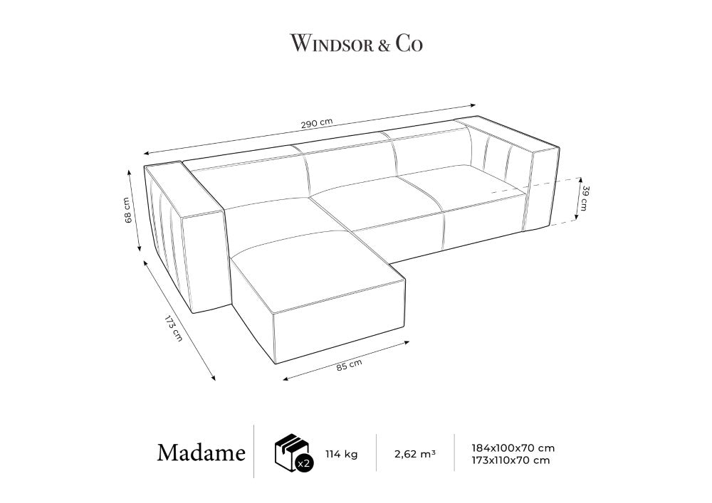 Leren hoekbank rechts Madame is de perfecte combinatie van elegantie en tijdloze vorm. De geometrische, enigszins strakke vorm past uitstekend in modern klassieke interieurs met een vleugje moderniteit. Decoratieve stiksels op de leren bekleding geven het geheel een bijzondere uitstraling. Houten poten van beukenhout zien er niet alleen prachtig uit, maar bieden ook een stevige basis.