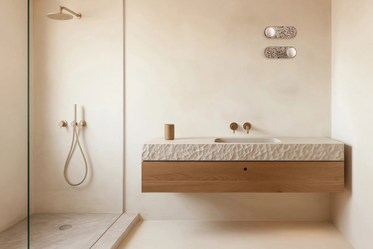 De basis van de wandlamp is gemaakt van terrazzo “Vol van Traditie”, vervaardigd door het Poolse atelier HANK, dat is ontstaan uit in hars verzonken doorsneden van esdoorn, walnoot en fruitbomen. Hierdoor is elk exemplaar uniek, en het patroon van de nerven wordt een sieraad op zich. De lichtbol is handgemaakt van opaalglas en wordt rechtstreeks op de armatuur gemonteerd met behulp van een metalen schroefdraad – een functionele en duurzame oplossing.