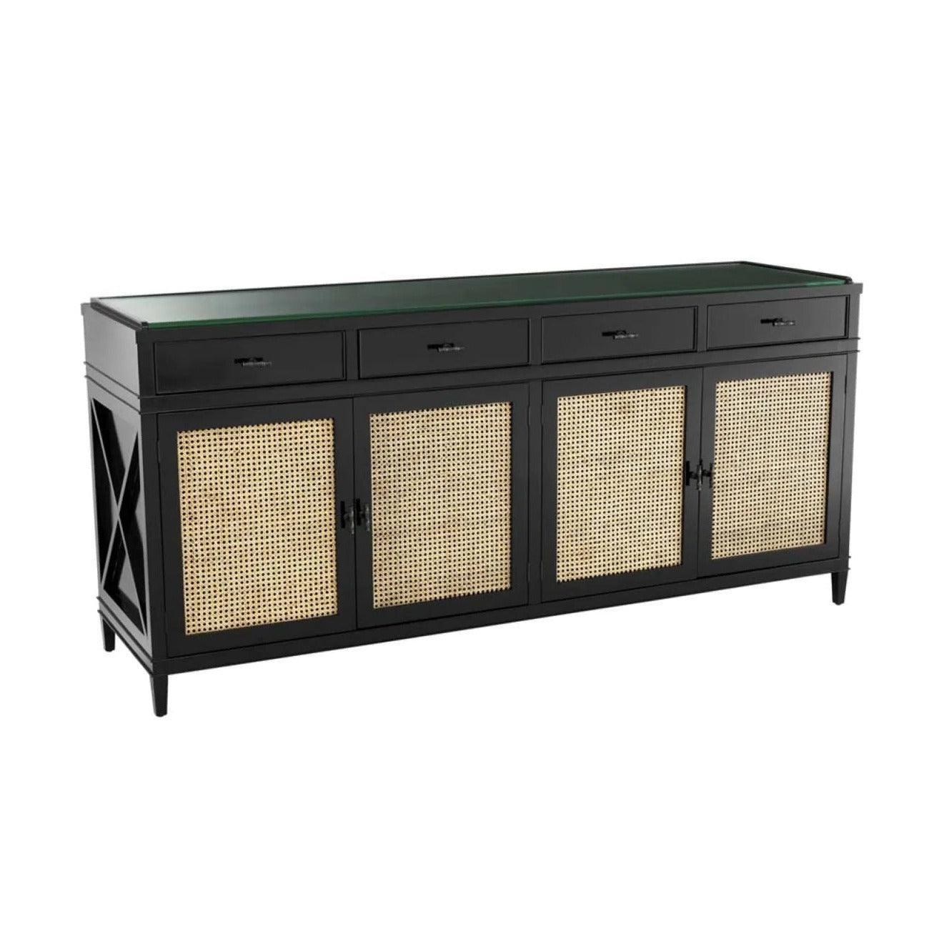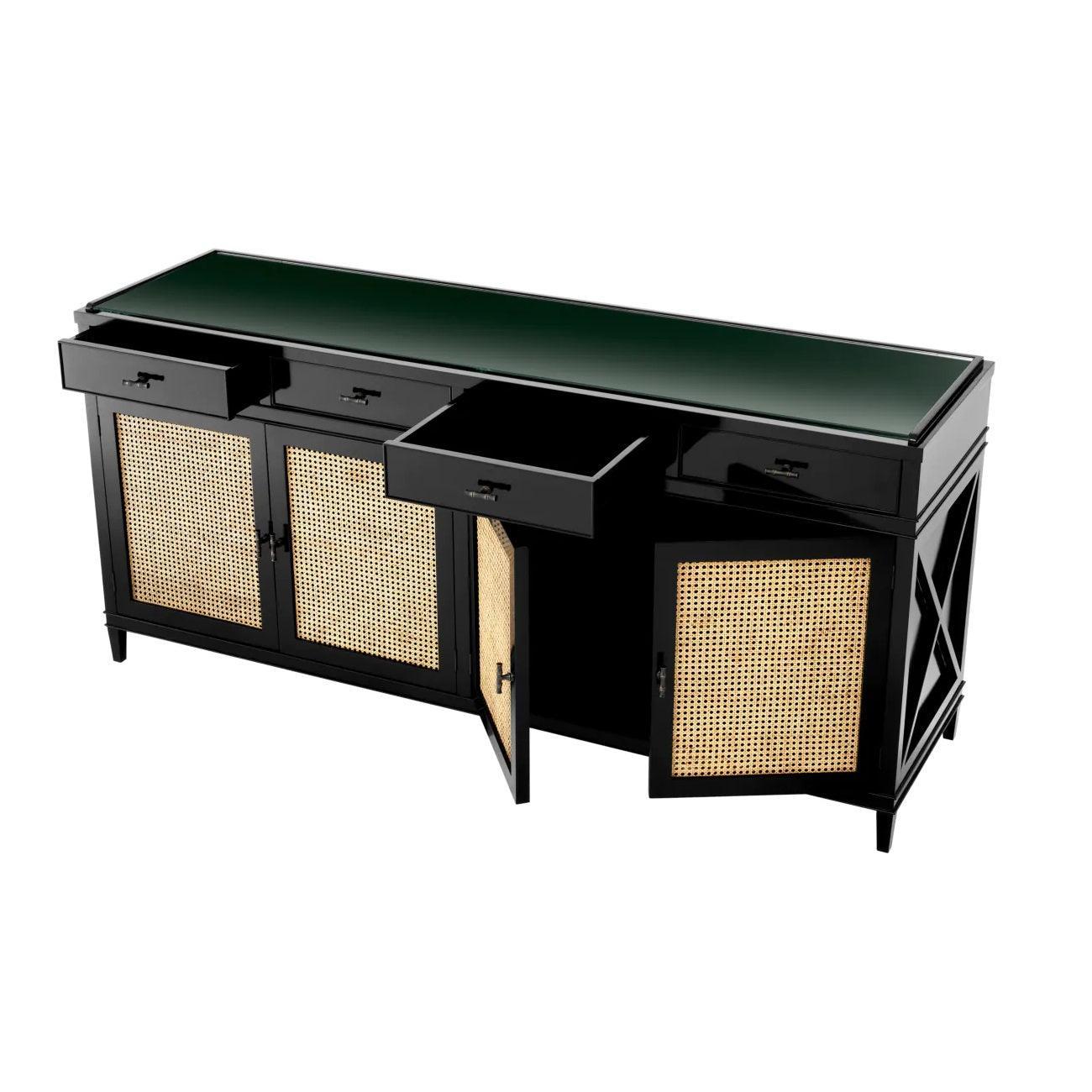 Voorzien van een dubbele kast met twee lades, een houten plank en twee deurtjes, biedt de commode Bahamas veel ruimte voor het opbergen van verschillende voorwerpen. Gemaakt van mahoniehout, natuurlijke rietmat en helder glas, combineert deze commode verschillende materialen tot een harmonieuze eenheid. De zwarte afwerking geeft de commode elegantie en moderniteit, terwijl de dwarsbalken een extra ontwerpelement toevoegen dat haar unieke karakter benadrukt. De combinatie van verschillende texturen en kleuren maakt de commode Bahamas niet alleen een praktisch meubel, maar ook een decoratief accent dat de aandacht trekt.