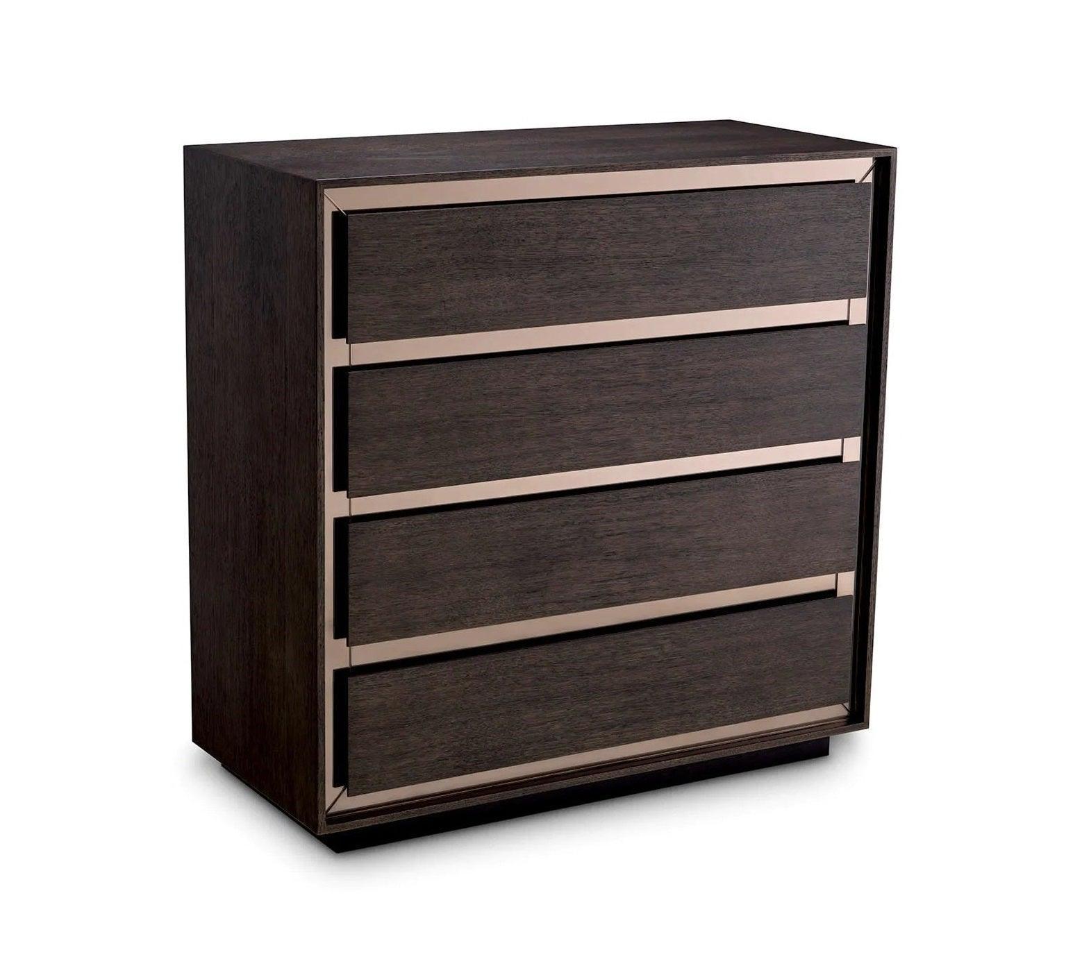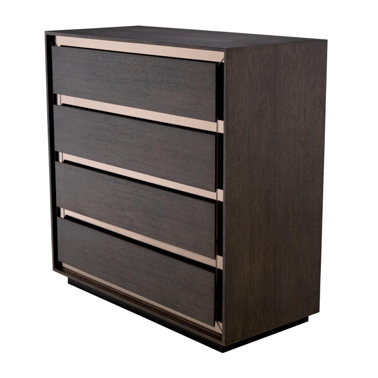 Eikenhouten commode Cabas is een ware parel van hedendaagse interieurdecoratie. Haar strakke, minimalistische lijn vestigt de aandacht op de details, terwijl het fineer van eenvoudig mokka-eiken haar een natuurlijke charme geeft. Vier lades zonder handgrepen presenteren zich uiterst modern, waardoor een vlak en glad oppervlak ontstaat, waarvan de eenvoud harmonieert met de subtiele schoonheid van het hout. Maar het spiegelglas rondom de lades geeft de commode Cabas een bijzondere uitstraling. De intrigerende tegenstelling tussen warm eiken en spiegelbrons geeft het meubel dynamiek en diepte, waardoor een indrukwekkende balans tussen traditie en moderniteit ontstaat.
