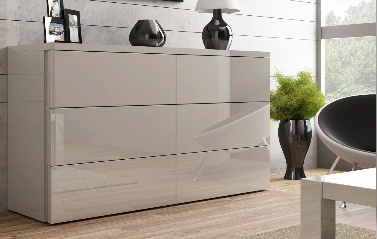 Mebel wykonany jest z wysokiej jakości płyty MDF, gwarantując trwałość i solidność konstrukcji. Dostępność dwóch wersji wykończenia – matowej lub lakierowanej na wysoki połysk – pozwala klientom dostosować designerską komodę Emma do swoich indywidualnych preferencji oraz aranżacji wnętrza. Bogata gama kolorów dodatkowo umożliwia dopasowanie mebla do różnorodnych stylów i gustów.