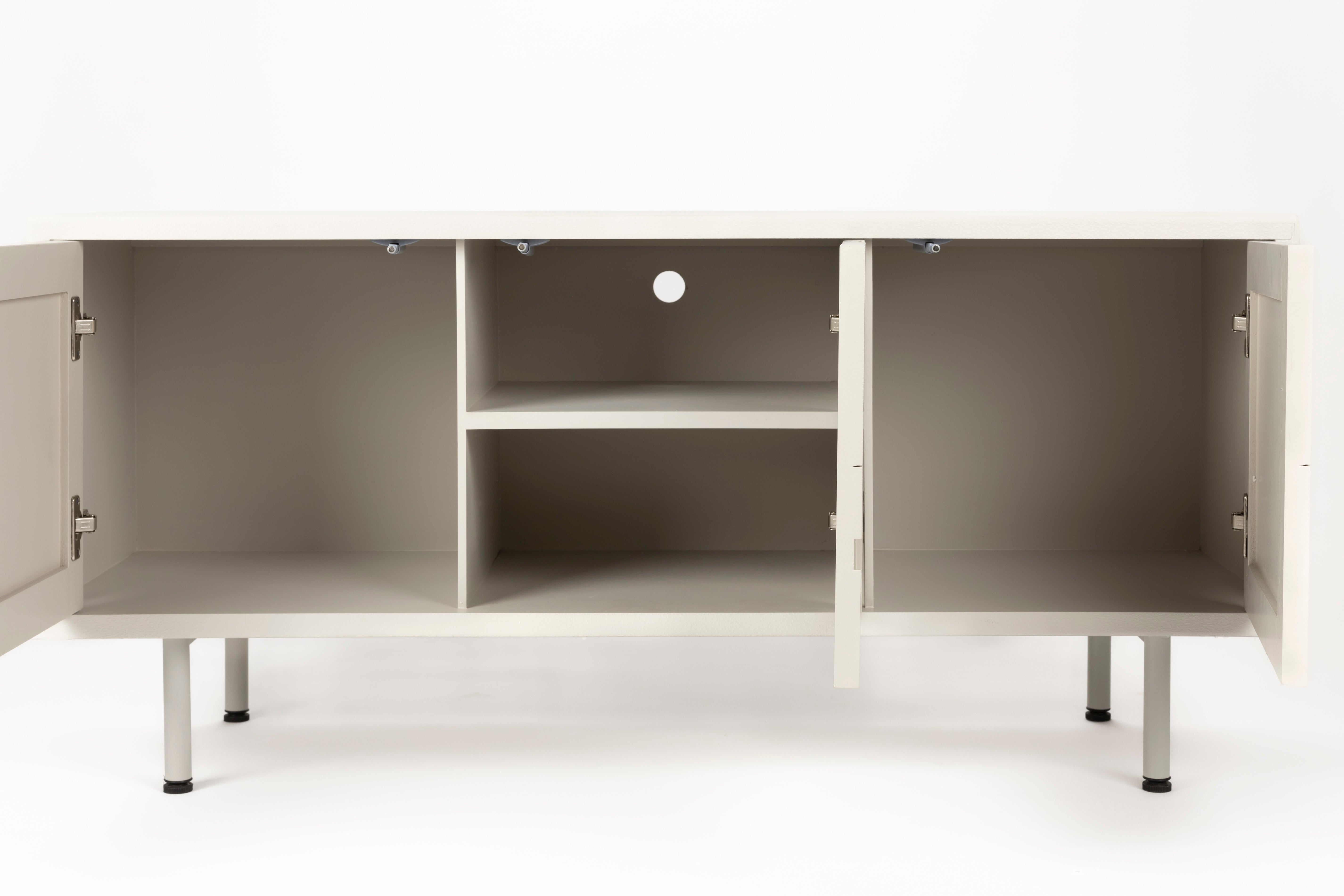 Elegante commode Funk in crèmekleur is de ideale oplossing voor wie waarde hecht aan modern design en functionaliteit. Geometrische frezingen op de fronten geven het een originele uitstraling, waardoor een 3D-effect ontstaat dat de aandacht trekt en de ruimte tot leven brengt. Slanke metalen poten zorgen voor een lichte uitstraling van de gehele constructie, terwijl ze tegelijkertijd stabiliteit bieden. De commode is perfect voor de woonkamer, slaapkamer of eetkamer en biedt een comfortabele opbergruimte.