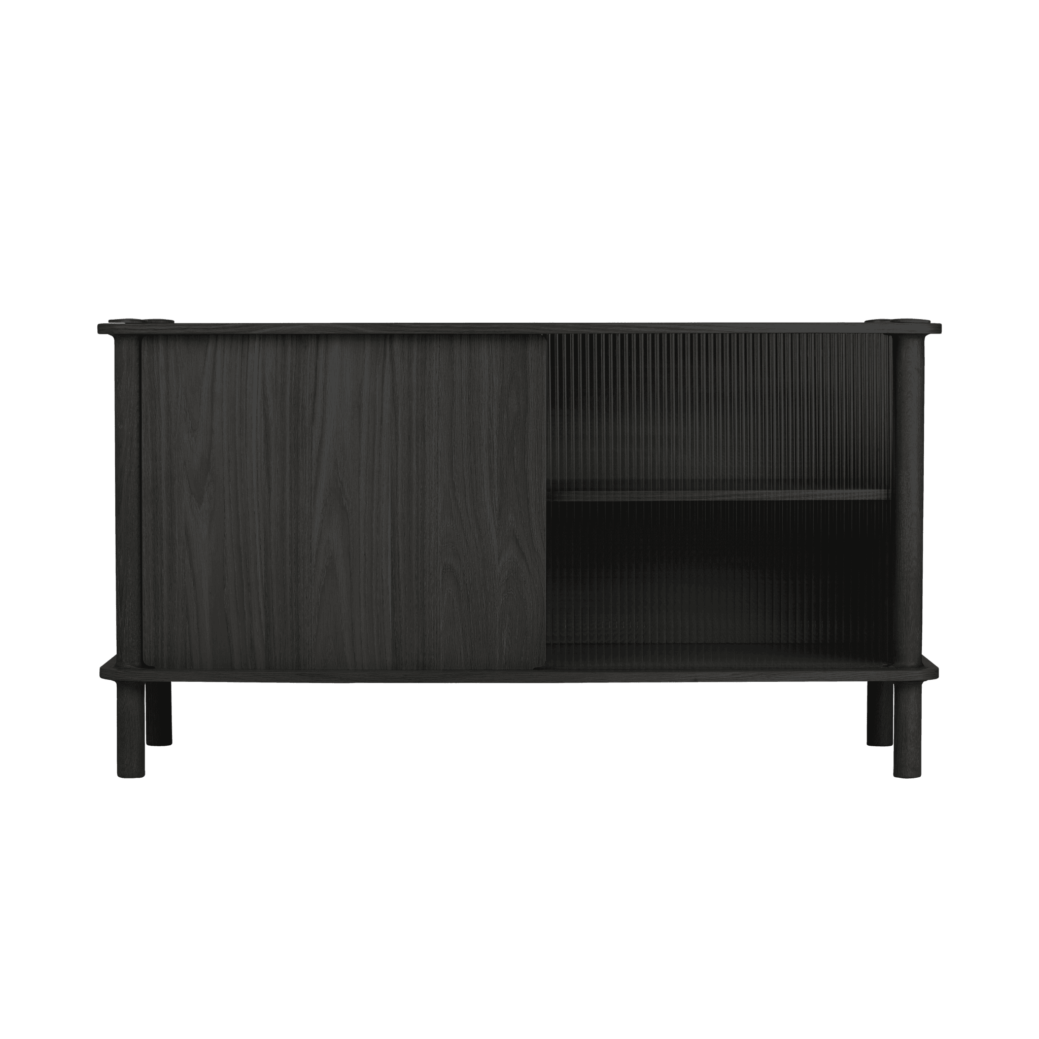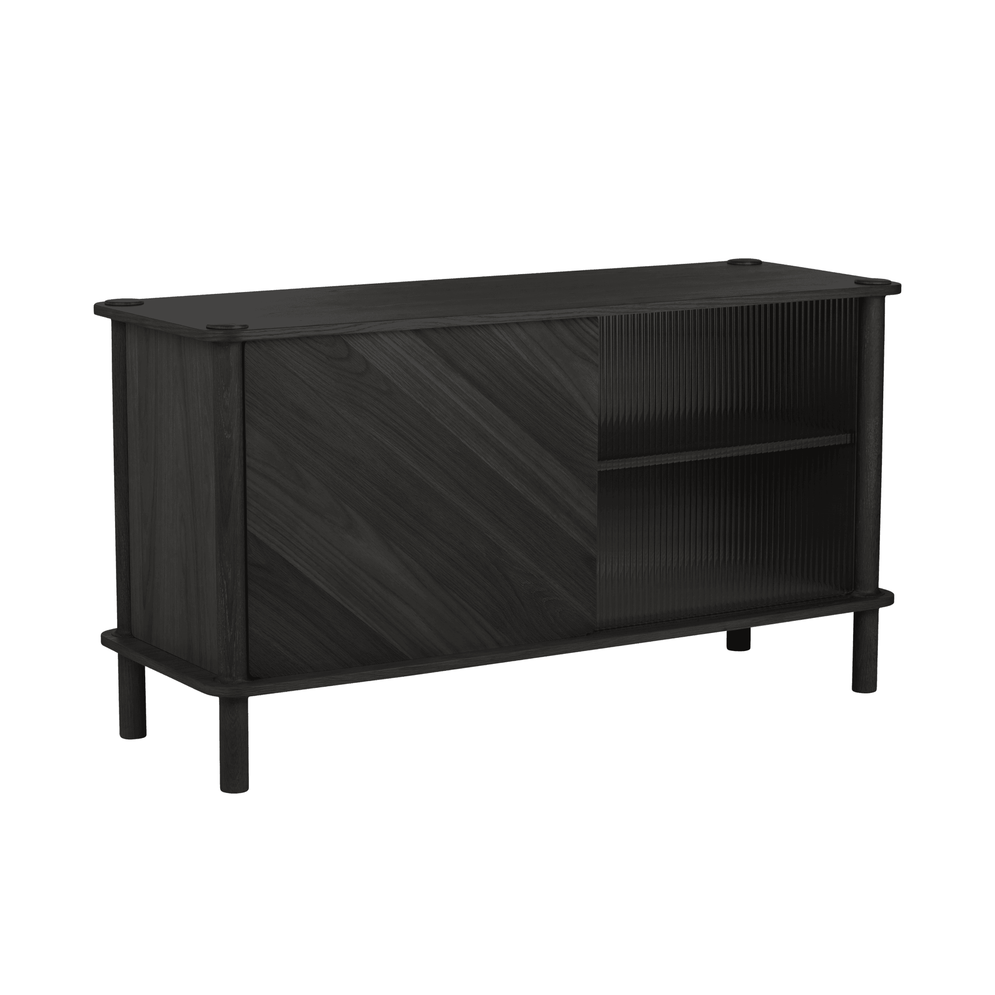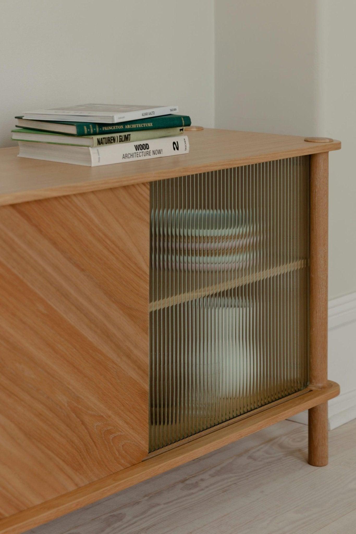 Dankzij de deuren van de commode, gemaakt van geribbeld glas of eikenhout, kunt u de esthetiek van uw interieur personaliseren en naar een hoger niveau tillen. De deuren zijn verwisselbaar en aanpasbaar, waardoor een effect ontstaat dat harmonieert met elke stijl. De houten deuren hebben een tweezijdige afwerking: de ene kant met een schuin fineerpaneel, dat het meubel een unieke uitstraling geeft, en de andere kant met een verticale fineerlaag, die zorgt voor een tijdloze look.