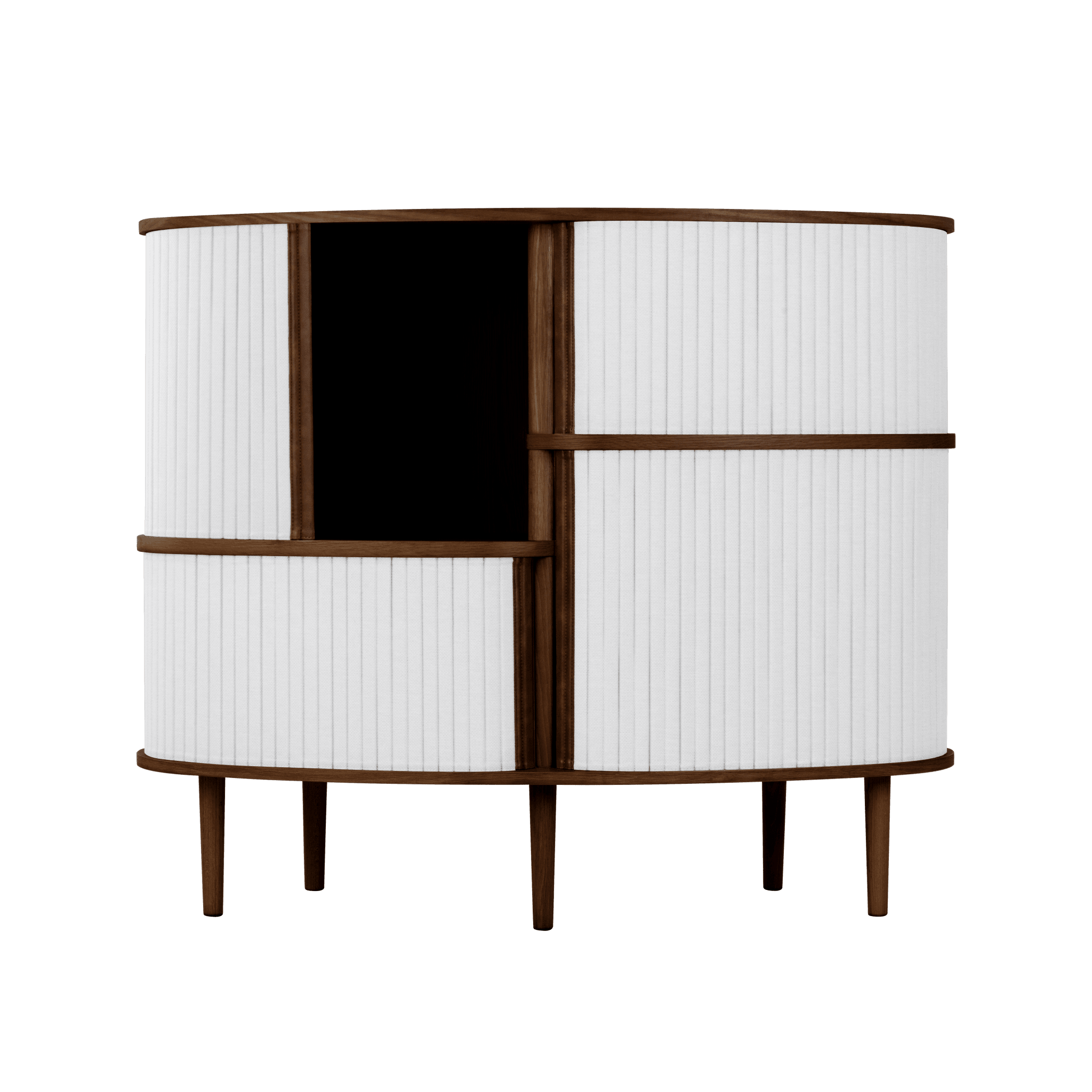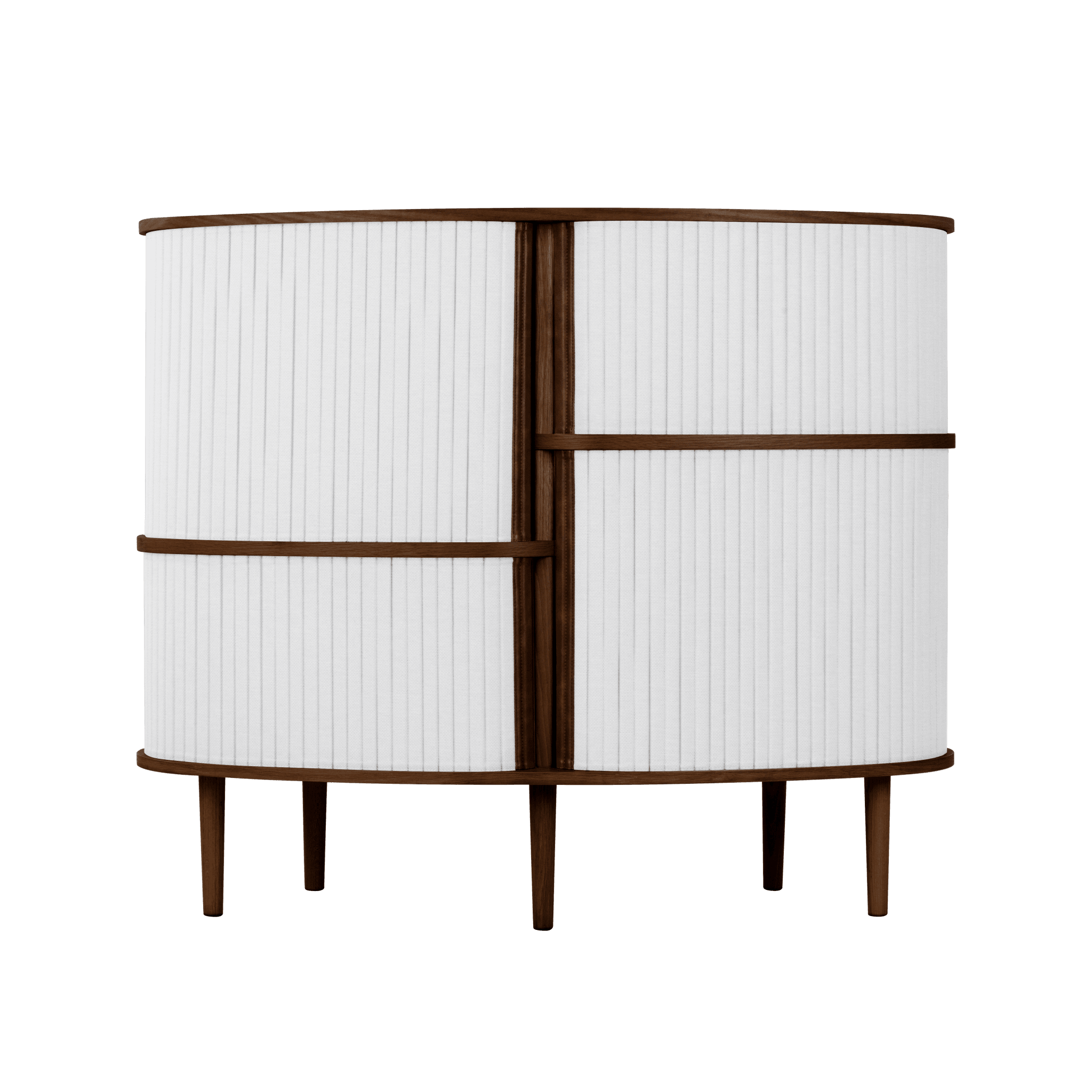 Kast is beschikbaar in twee kleuren: eiken en donker eiken, en de jaloezieën zijn verkrijgbaar in vier standaardkleuren van de Horizons-stof, die voor 100% uit gerecycled materiaal bestaat.