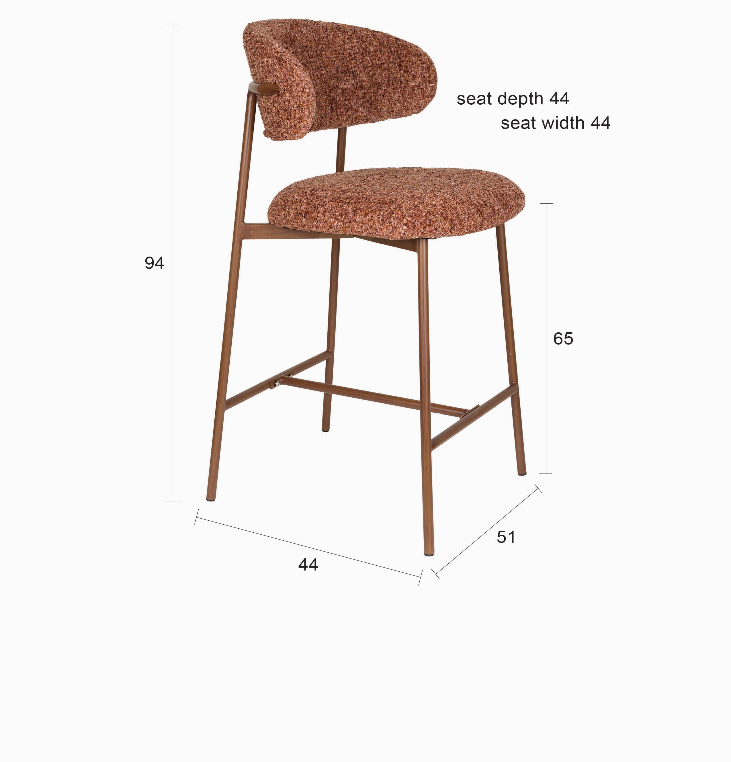 De diepe, notenhouten afwerking van de houten basis creëert een opvallend contrast met de stof, waardoor de stoel klassieke verwijzingen harmonieus verbindt met moderne trends. De stabiele, ijzeren constructie en uitstekende ergonomie zorgen voor comfort, zelfs bij langdurig gebruik. Dit is een functionele en stijlvolle aanvulling die perfect tot zijn recht komt bij een keukeneiland, hoge tafel of in een elegante eetkamer.