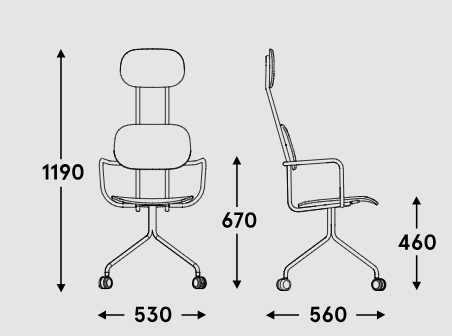 Bureau stoel met hoofdkussen New School gestoffeerd, ontworpen door Studio Form Us With Love, is beschikbaar in varianten met en zonder hoofdkussen. De moderne vorm met dubbele rugleuning trekt onmiddellijk de aandacht, terwijl de gestoffeerde zitting zorgt voor gebruikscomfort, ideaal voor kantoren, onderwijsinstellingen en conferentieruimtes. Dankzij de armleuningen en wielen kan de gebruiker genieten van volledige bewegingsvrijheid en een comfortabele zithouding. De stoffering in combinatie met het metalen frame creëert een moderne, elegante uitstraling die kan worden aangepast aan elke interieurinrichting.