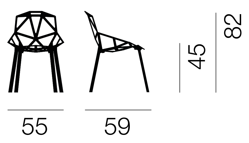 De stoel Chair_One is gemaakt van duurzame en stevige materialen, wat zorgt voor zijn levensduur en weerstand tegen beschadigingen. De constructie van de stoel is gebaseerd op driehoekige vormen, wat hem een moderne en unieke uitstraling geeft. De basis van de stoel is gemaakt van beton, geschilderd in een transparante natuurlijke of zwarte kleur, wat extra elegantie toevoegt.