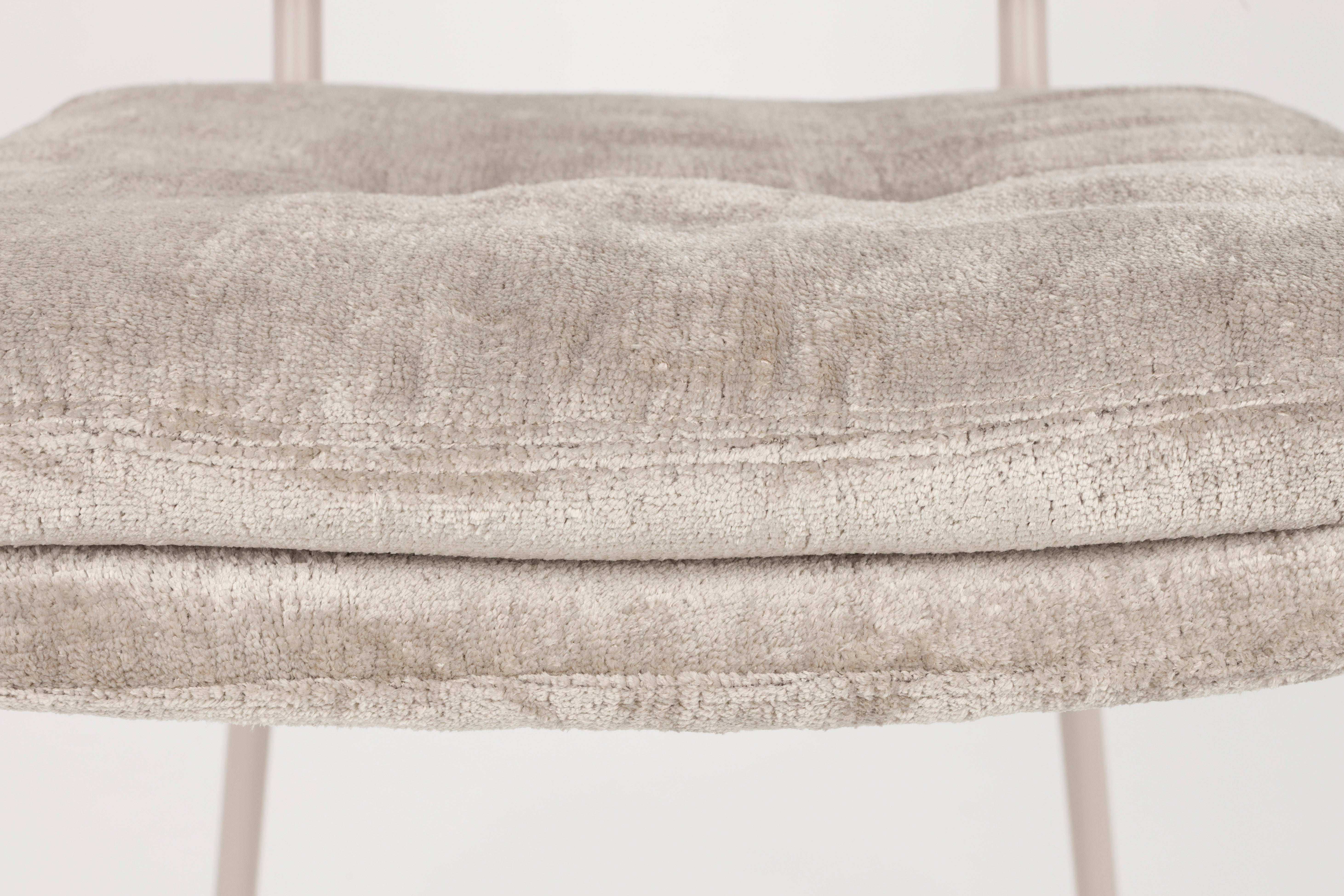 Zachte, gestikte zitting en rugleuning zorgen ervoor dat deze beige stoel niet alleen elegantie, maar ook uitzonderlijk comfort in uw interieur brengt. De subtiel glanzende bekleding van polyester in combinatie met de lichte stalen basis creëert een harmonieuze en gezellige geheel, perfect voor de woonkamer, eetkamer of een werkhoek.