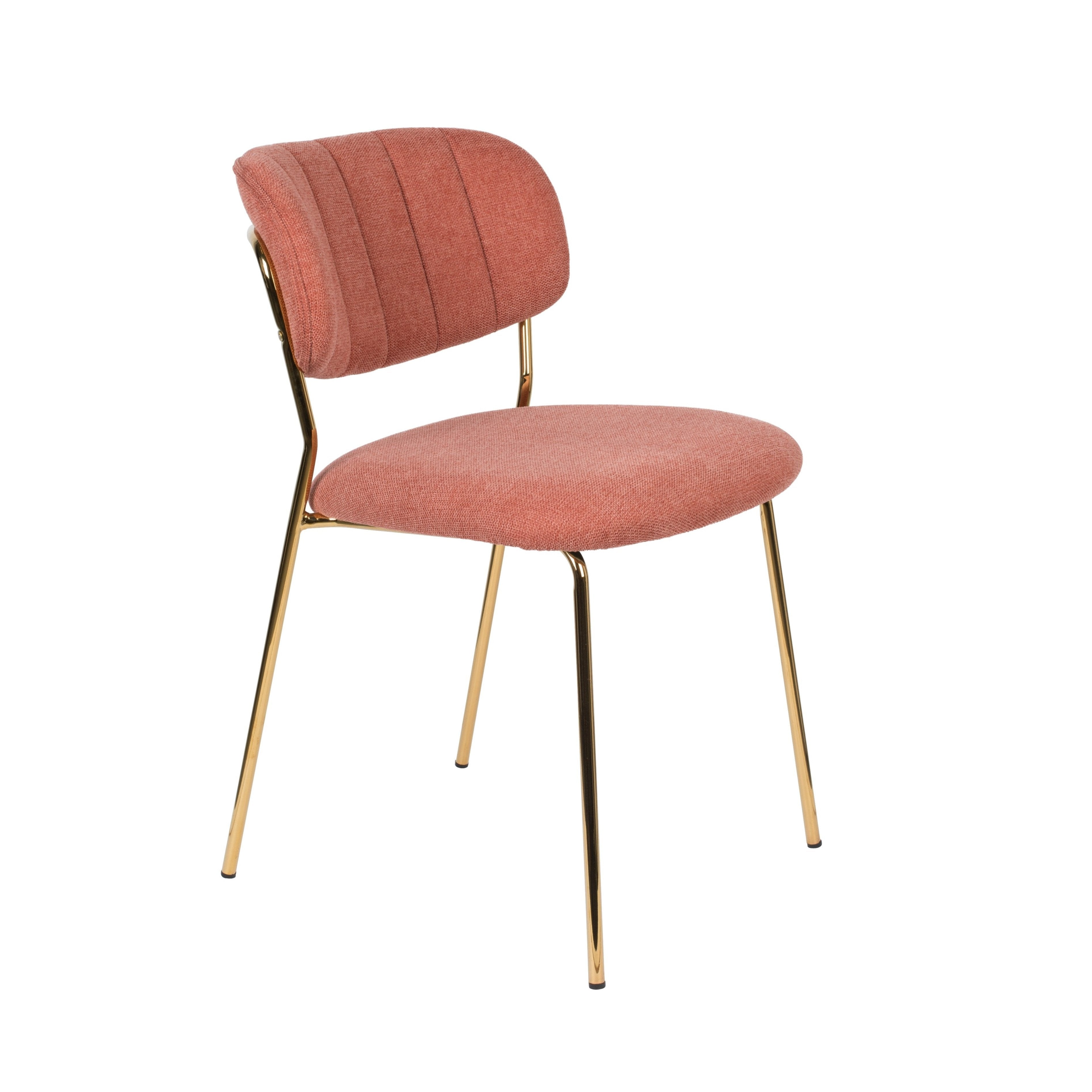 Stoel Jolien is de ideale aanvulling voor een modern ingerichte eetkamer of woonkamer, en past ook perfect in een vrouwelijke kantoorruimte of schoonheidssalon. De stabiliteit wordt gegarandeerd door de slanke, metalen poten die zijn geschilderd in een glanzende gouden kleur, wat een luxe uitstraling toevoegt.