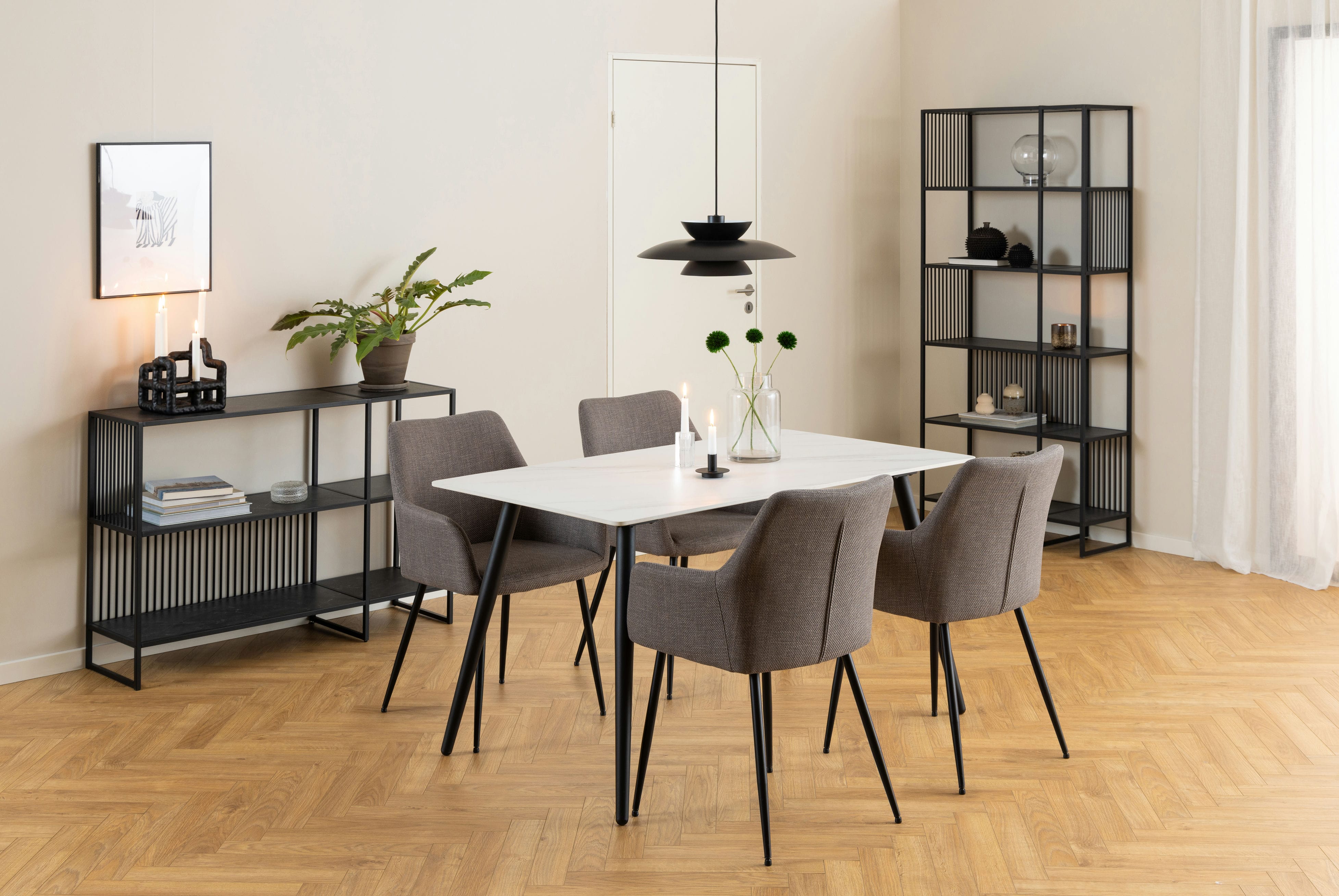 Krzesło do jadalni Lizzy wyróżnia się ponadczasową elegancją i funkcjonalnością. Jest obite tkaniną Basel w odcieniu jasnoszaro-brązowym, co nadaje mu dwukolorowy, strukturalny wygląd. Komfort użytkowania podnoszą praktyczne podłokietniki oraz smukłe nogi wykonane z matowej czarnej stali, malowanej proszkowo.