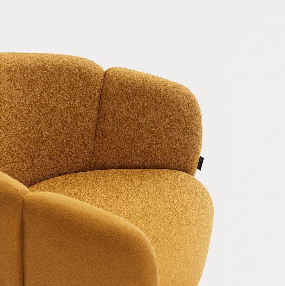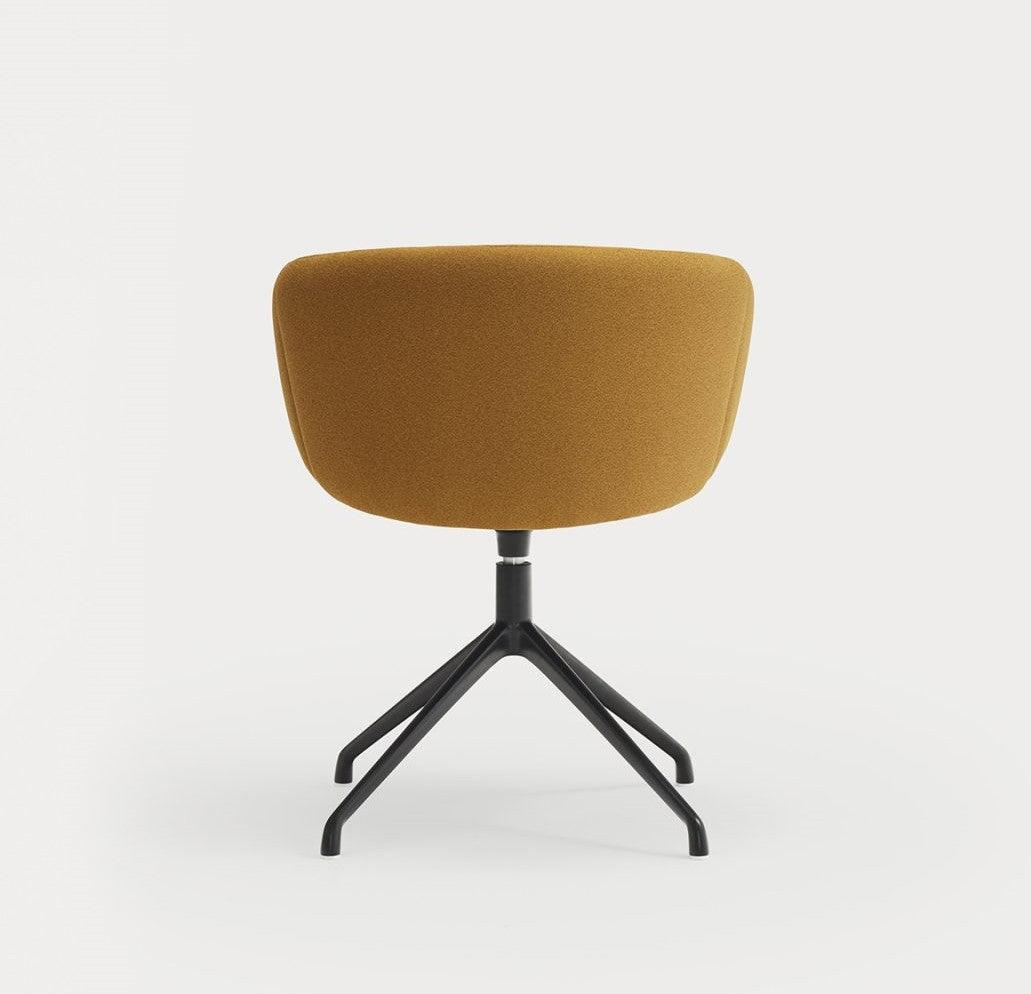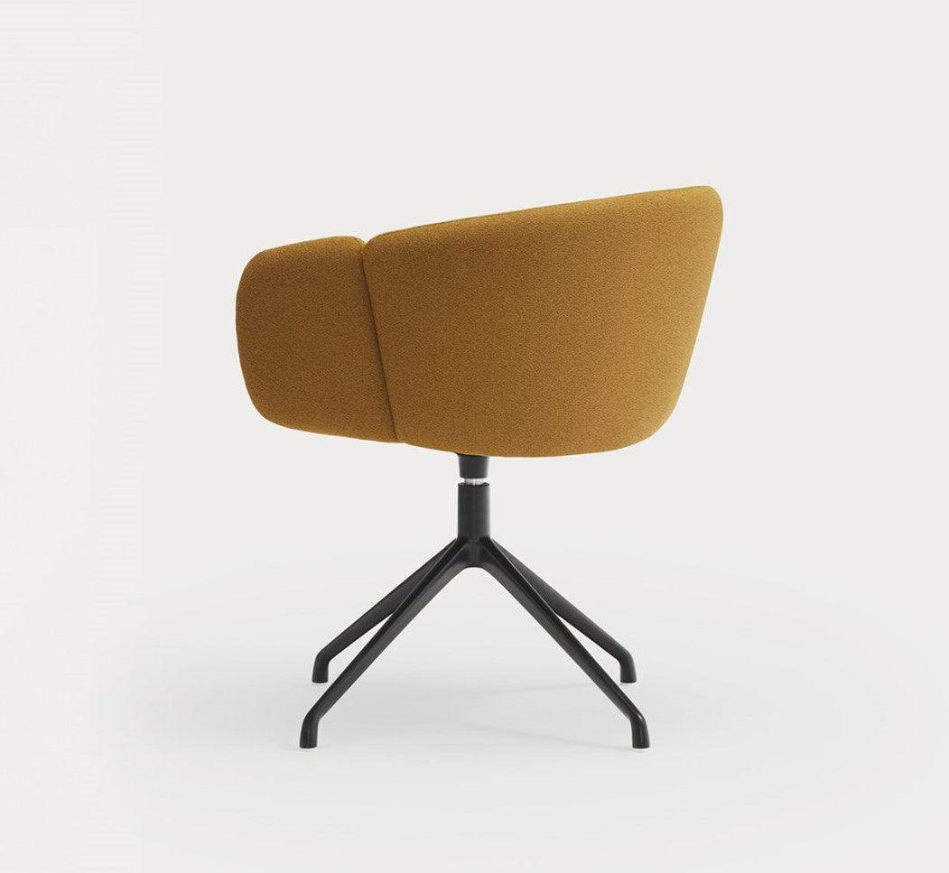 De draaistoel met armleuningen Add in mosterdkleurige stof is niet alleen een elegant meubelstuk, maar ook een garantie voor uitzonderlijk comfort en ergonomische ondersteuning. Bij het ontwerpen van deze stoel was het prioriteit om een plek te creëren voor werk of ontspanning die perfect aansluit op de natuurlijke krommingen van het lichaam. De volledig gestoffeerde rugleuning buigt zachtjes, omarmt de gebruiker en maakt vrij bewegen en het veranderen van positie mogelijk dankzij de brede zitting.