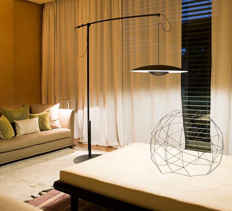 Dankzij de originele oriëntatie en het ophangsysteem hangt de kap van deze vloerlamp aan een constructie die het plafond vervangt. De stang en het ophangsysteem maken het mogelijk om de kap naar voren en naar achteren, evenals zijwaarts te verplaatsen. Bovendien kan het armatuur van koolstofvezel op twee manieren worden ingesteld, afhankelijk van de positie. Deze versie van de Ginger vloerlamp is een opvallende en veelzijdige armatuur die een lichte indruk en subtiele fysieke aanwezigheid behoudt, terwijl het uitstekende verlichting biedt zonder de ruimte te overweldigen. Dit ontwerp is beschikbaar in twee maten, wat zorgt voor een perfecte pasvorm, ongeacht de ruimte.
