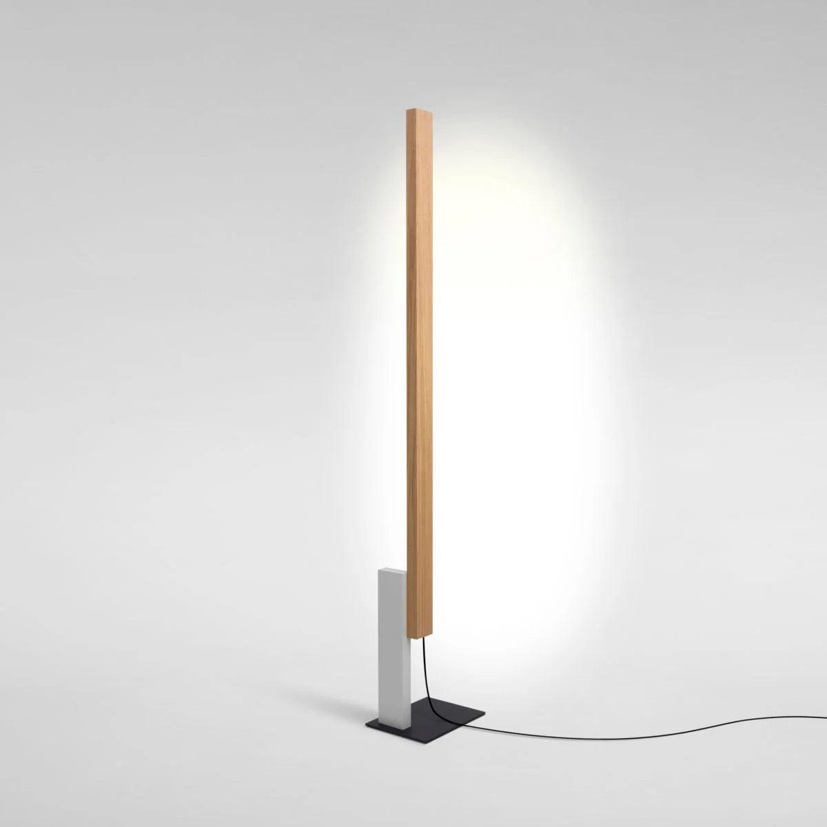 Formeel is het een compositie van volumes en kleuren. Drie blokken die zich onderscheiden door hun vormen en tinten: een verticale, lichtdoorlatende element van eikenhout of wengé is bevestigd aan een blok van gelakt hout. Beide stijgen boven een zwarte basis uit, die de optimale afstand bepaalt waarop de lamp van de muur moet worden geplaatst om de ideale lichtbron te genereren. De strengheid van de vormen contrasteert met de warmte van het hout en de diepte van de kleuren.