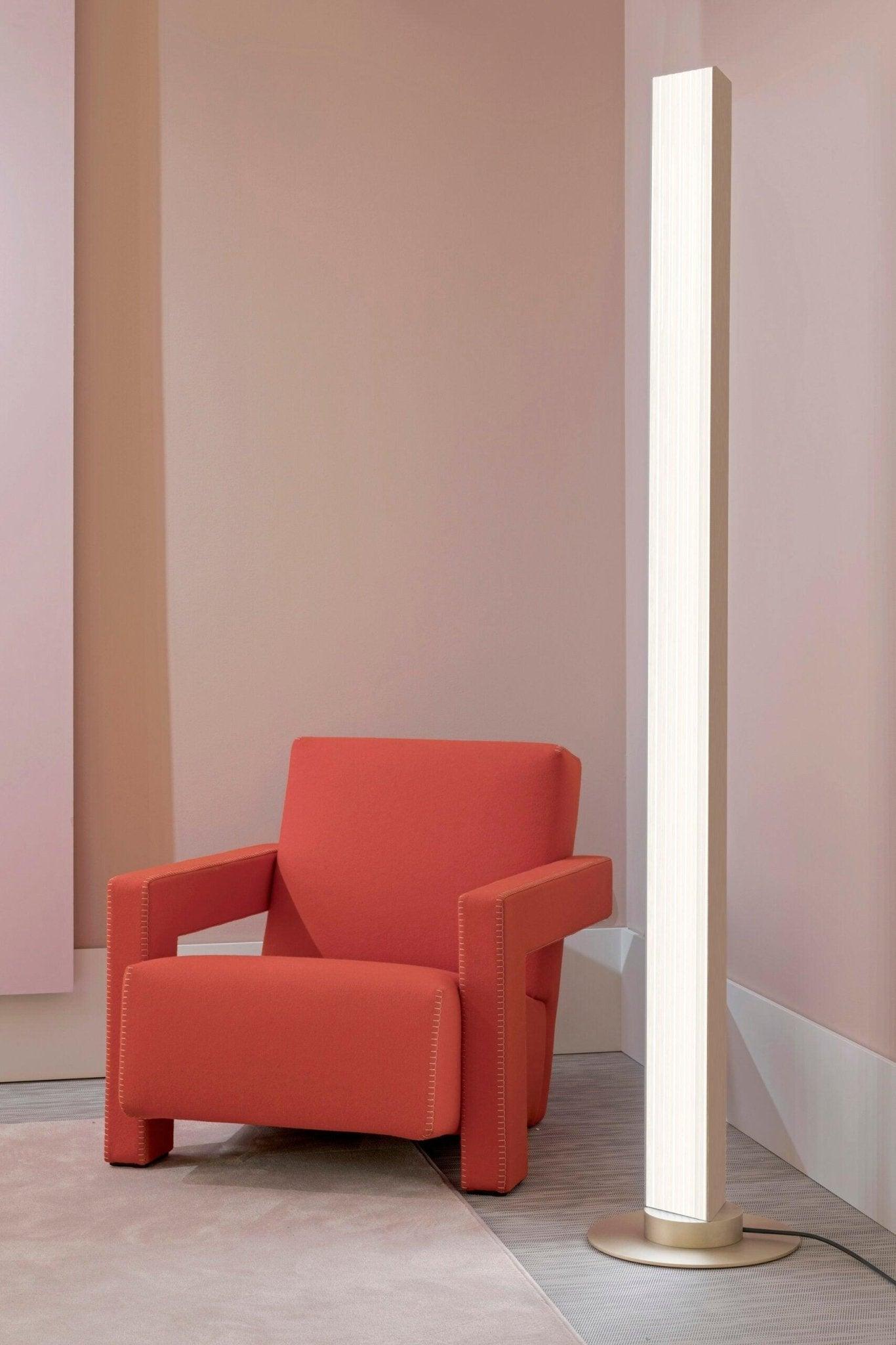 Vloerlamp Stick heeft een waardevolle eenvoud en kan tot 340 graden draaien, wat het mogelijk maakt om direct of indirect licht te verkrijgen, afhankelijk van de behoeften. Driehoekige elementen met pure, essentiële lijnen die sfeervol licht uitstralen en tegelijkertijd functioneel zijn. Het licht speelt een leidende rol dankzij de geribbelde diffuser, die speciaal is gekozen om een unieke lichtspel te creëren in verschillende contexten.