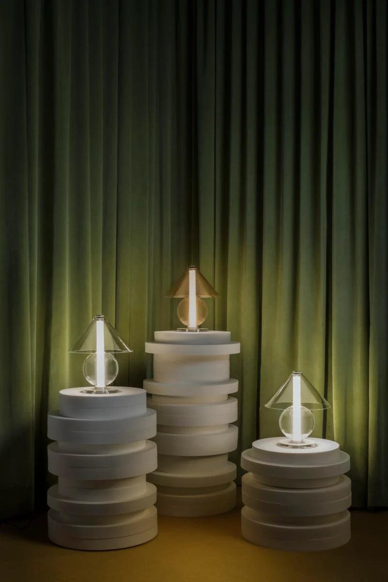 In zijn vorm vinden we resten van het verleden; in het materiaal vinden we emoties. Glas onthult niet alleen de lichtbron, maar spreekt ook over zuiverheid, lichtheid en hoe dit ontwerp zich in de omgeving voegt. Zijn structuur lijkt moeiteloos te staan, een zeer serieuze prestatie waarin alles zichtbaar is. De cilinder werpt warm, diffuus en geleidelijk licht.