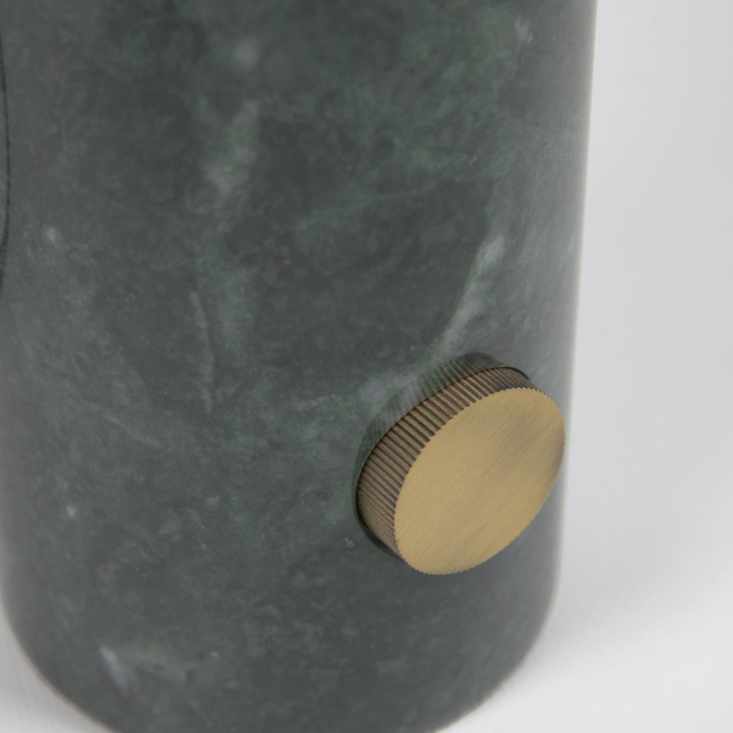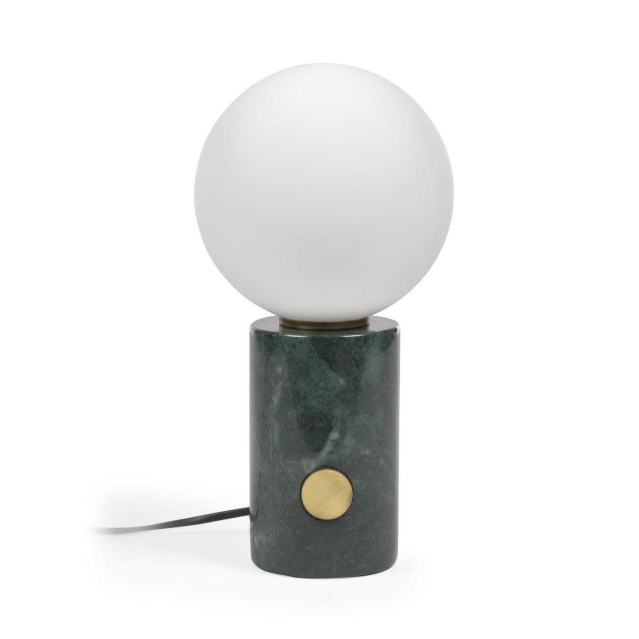 De collectie lampen Lonela valt op door de bolvormige kap van mat glas, bevestigd aan een marmeren voet met een groene afwerking. Een ontwerp dat op zichzelf al straalt.