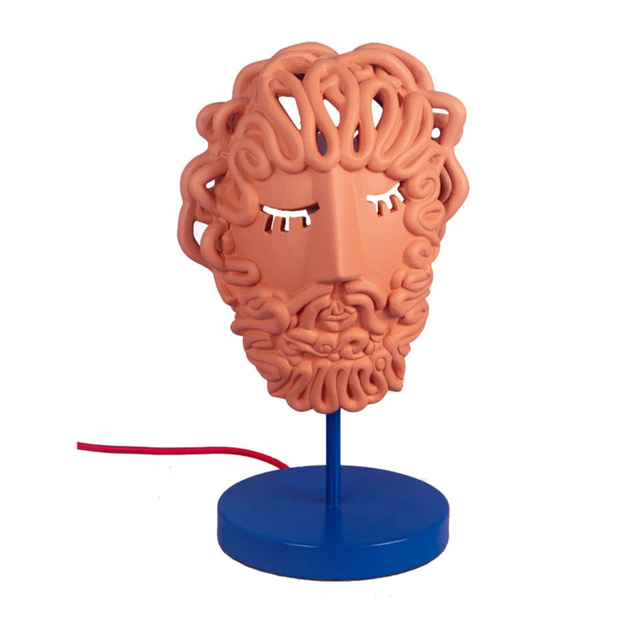 Gemaakt van terracotta, de lamp verrast met zijn natuurlijke textuur en warme kleuren, die een gezellige sfeer aan het interieur toevoegen. De artistieke vorm doet denken aan de masker van de legendarische Odysseus, waardoor een element van mythologie en geschiedenis in de ruimte wordt gebracht. Subtiele details, zoals de gesloten ogen en de kenmerkende baard, geven het een unieke uitstraling.