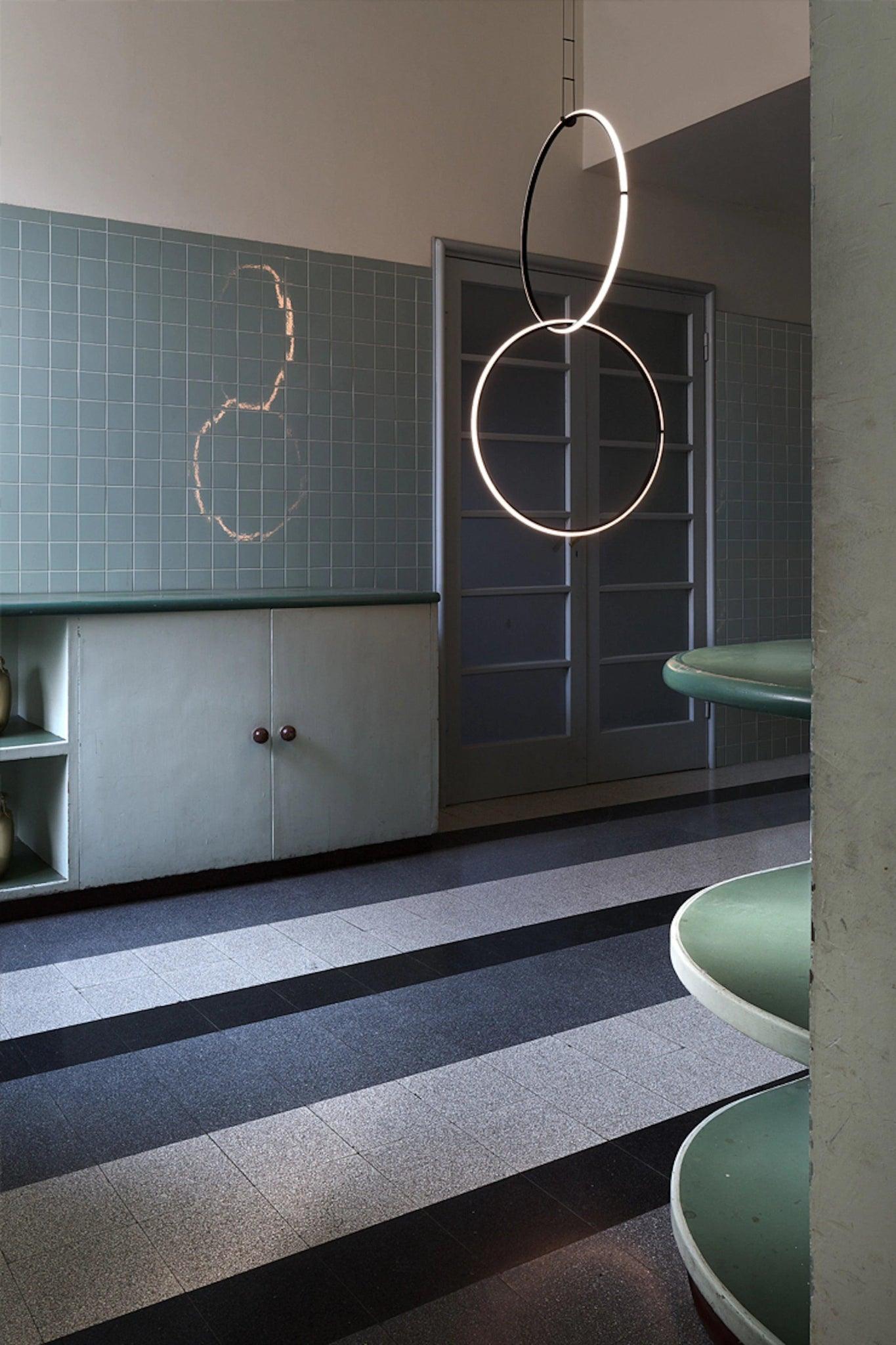 Geïnspireerd door de minimalistische kunst, hanglamp Arrangements verbindt moeiteloos licht en sculptuur, en creëert een opvallend grafisch verlichtingsontwerp. De aluminium behuizing, poedergecoat in zwart, en gemonteerd aan een kabel, roept een duidelijk stijlvolle sfeer op. Afstappend van de ruwheid die typisch geassocieerd wordt met neon, stralen deze innovatieve lampen een warmere, uitnodigende gloed uit, waardoor een gezellige en comfortabele ambiance ontstaat. Elk element kan worden aangesloten op de voeding via een elektrisch en mechanisch aansluitingssysteem dat is ontworpen met het oog op het aanpassen van de productconfiguratie.